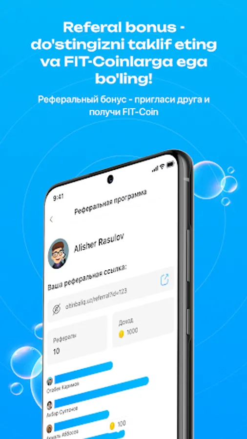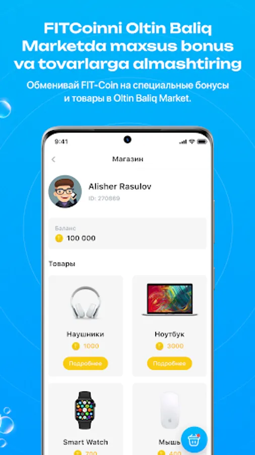 Зарабатывайте FITCoin в нашем приложении: приглашайте друзей и пользуйтесь Премиум. Обменивайте FITCoin на специальные бонусы и товары в Oltin Baliq Market.