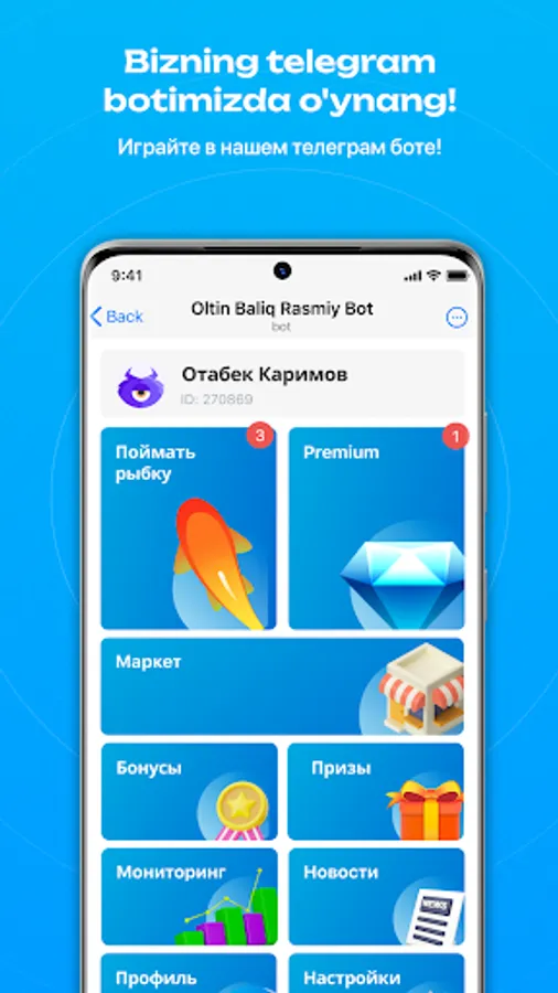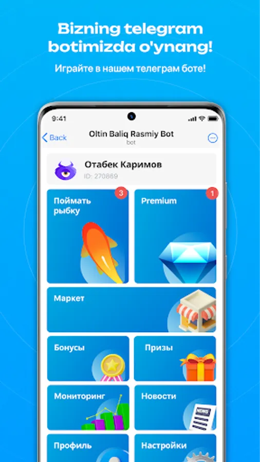 Bonuslar olish uchun har kuni 3 ta imkoniyat mavjud. Ko'proq bonuslarga ega bo'lishni istasangiz Premium baliqni taklif etamiz. Premium - bonus turini o'zingiz tanlash va yanada ko'proq foyda olish imkoniyatidir!