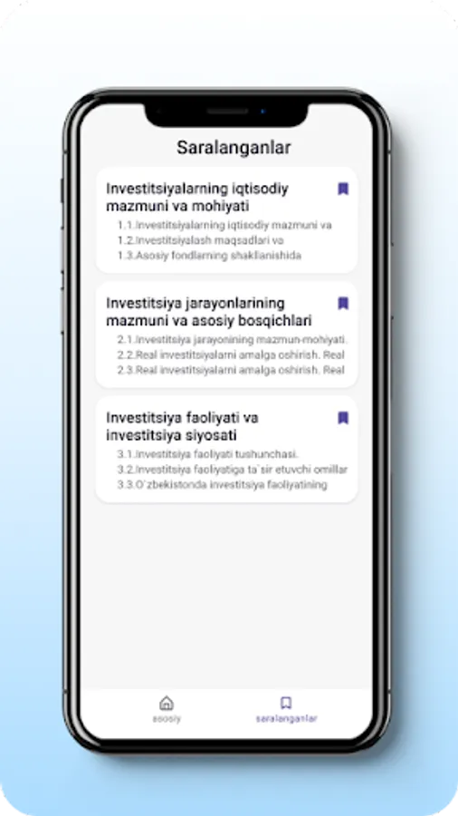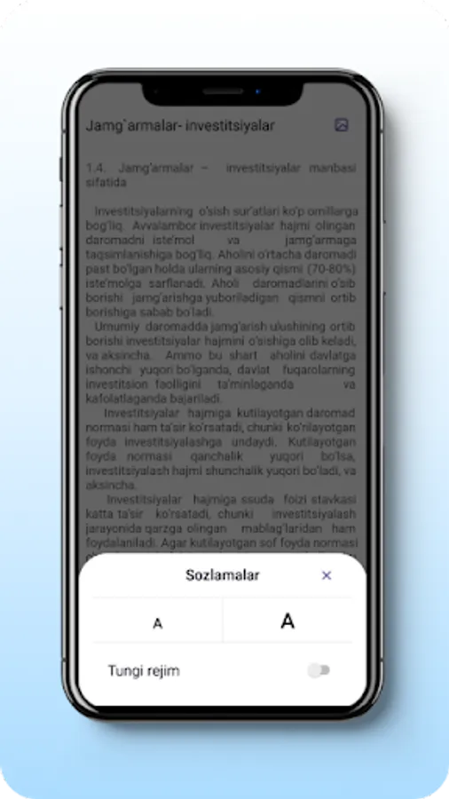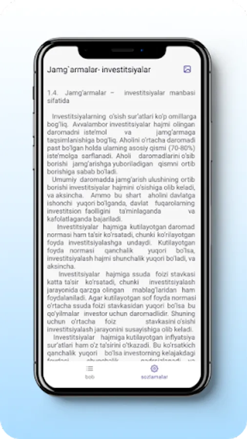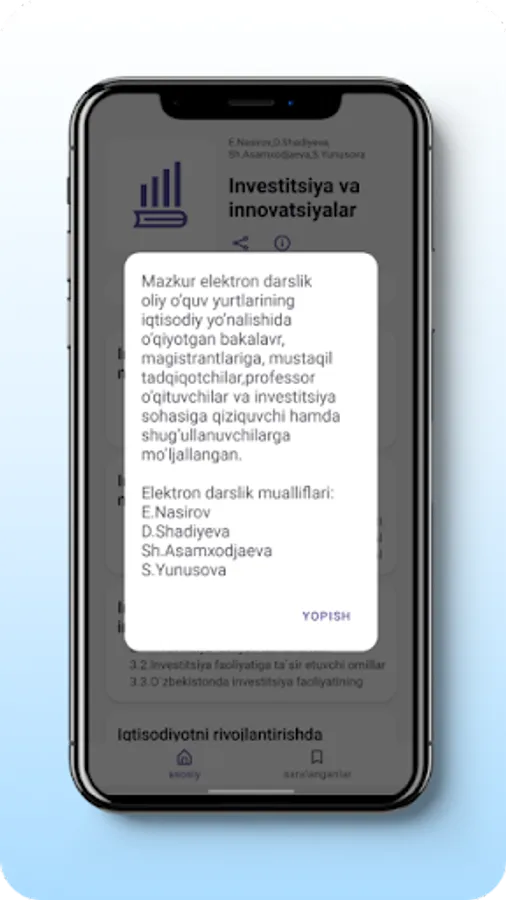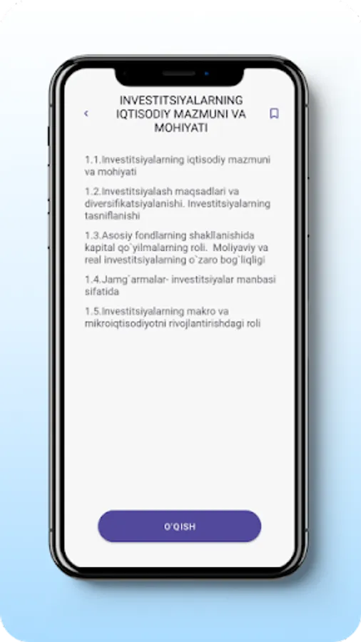 Android operatsion tizimida ishlaydigan mazkur ilova ko'rinishidagi darslik foydalanuvchilar uchun darslikni qulay tarzda o'rganish uchun ishlab chiqilgan.
