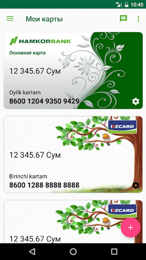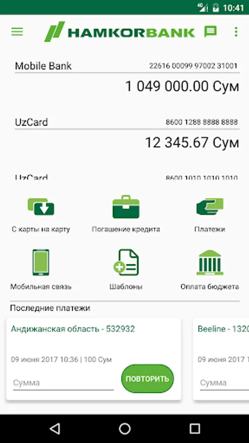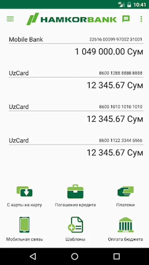 You can attach plastic cards of any banks (UzCard and Humo) to the Hamkor Mobile application. Using the Hamkor Mobile application, you can: