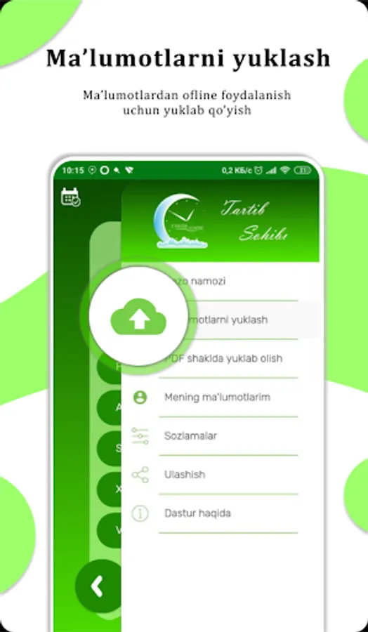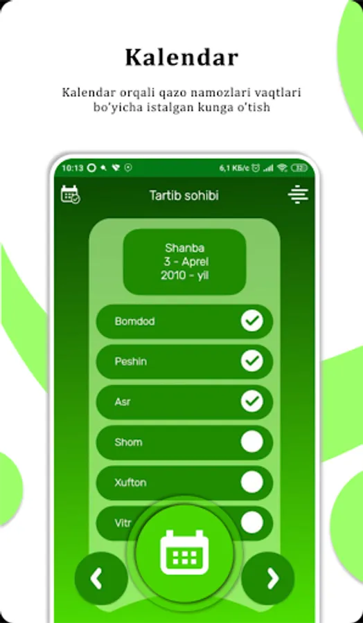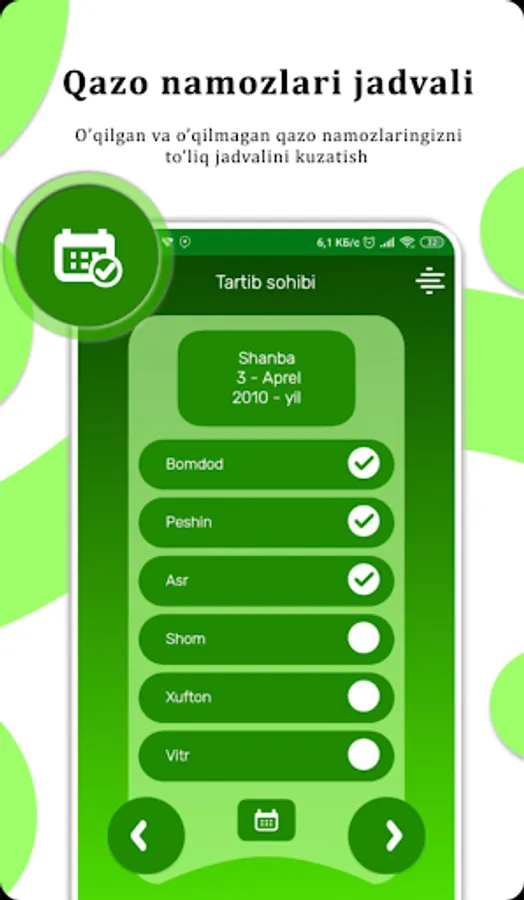 * Dastur qoldirib yuborilgan (qazo) namozlarni tartibli o'qib borishga mo'ljallangan.