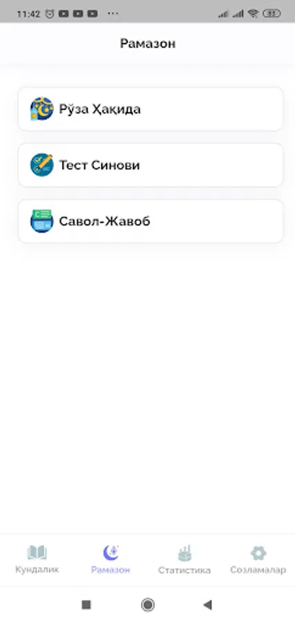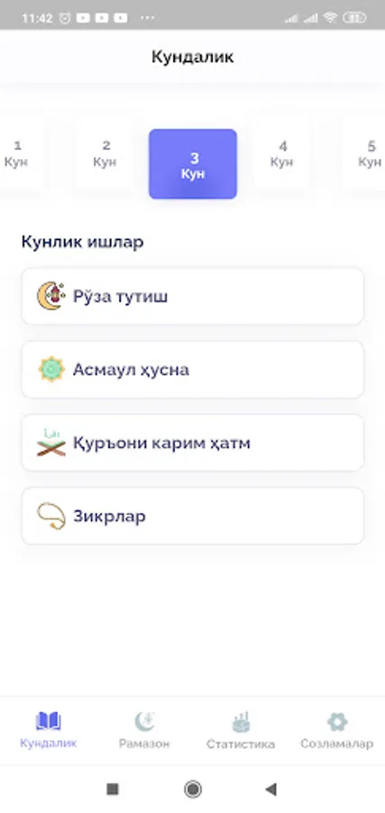 Рамазон кундалиги дастури орқали сиз рамазон ойида тутилиши керак бўлган рўзани, Қуръон тиловати ва зикрларни қайд эътиб боришингиз мумкин. Ҳар куни Рамазон ойининг бошидан бошлаб то белгилаган кунингизгача бўлган статистикани кўриб, назорат қилиб боришингиз мумкин. Ойнинг охирида эса сиз қанча рўза тутганингизни, Қурони Каримни неча пора ўқиганингизни, Рамазон ойида қанча зикр қилганингизни, Асмаул ҳуснани қанчасини ёдлаганингизни статистика саҳифасида кун ҳисобида фоизларда кўриб таҳлил қилишингиз мумкин. Бу дастурда рўзага доир муҳим маълумотлар, рўзага доир савол жавоблар ва рўзага доир тестларни ечишингиз мумкин.
