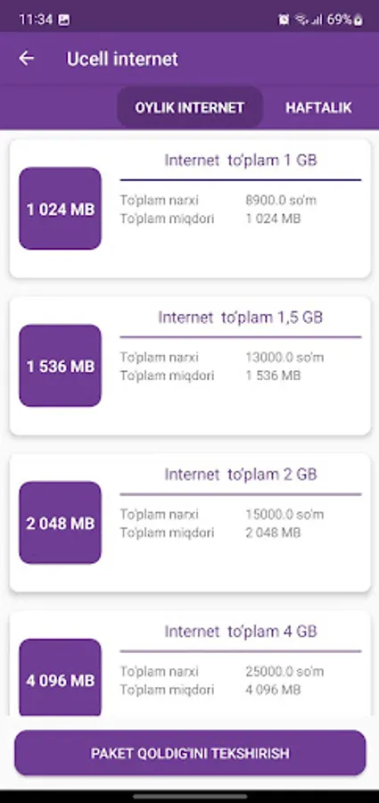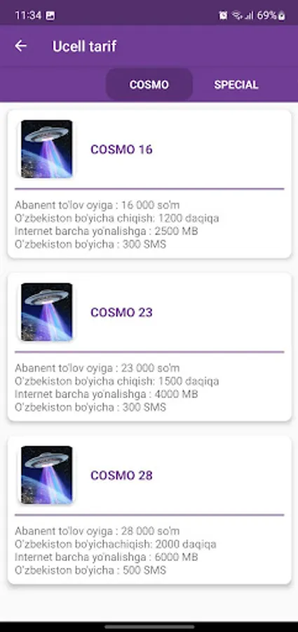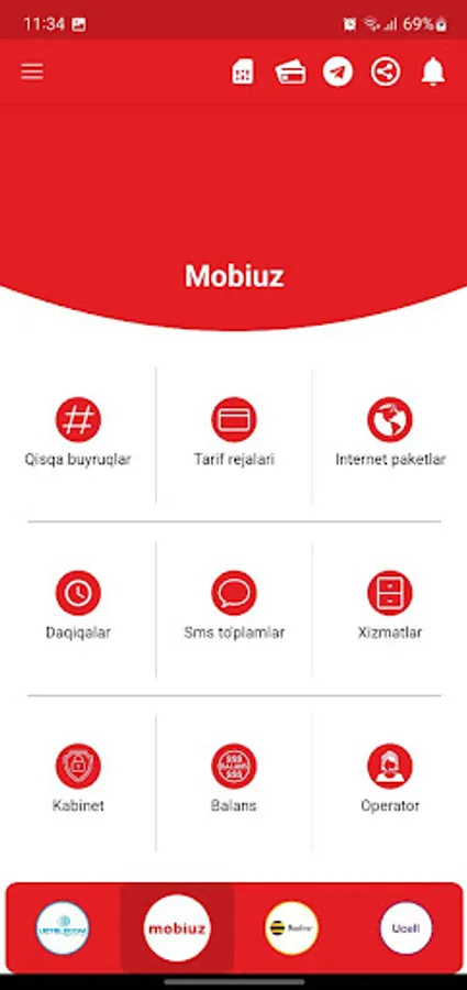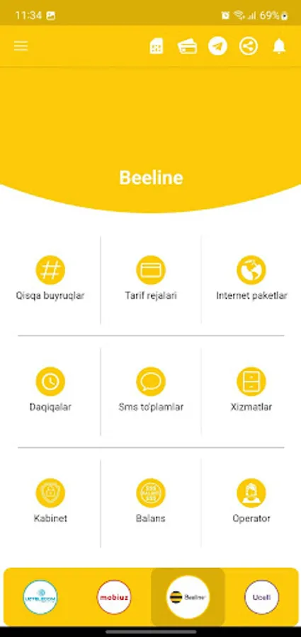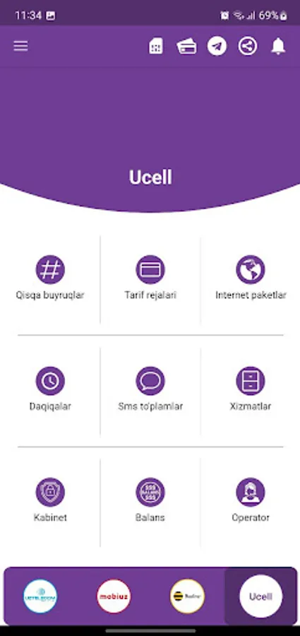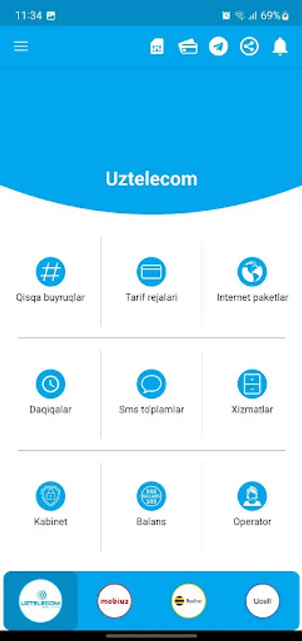 Ushbu ilova sizga 4 aloqa kompaniyalarining (Ucell, Beeline, Mobiuz, UzTelecom) barcha turdagi xizmatlarini (Tariflar, Internet, Sms, Daqiqalar, Ussd) taqdim etadi.