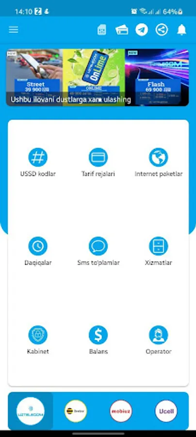 Ushbu ilova sizga 4 aloqa kompaniyalarining (Ucell, Beeline, Mobiuz, UzTelecom) barcha turdagi xizmatlarini (Tariflar, Internet, Sms, Daqiqalar, Ussd) taqdim etadi.