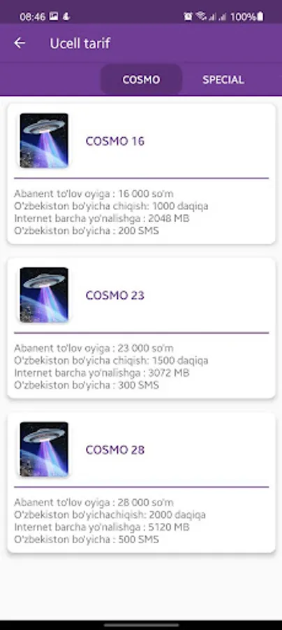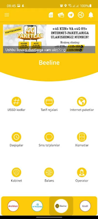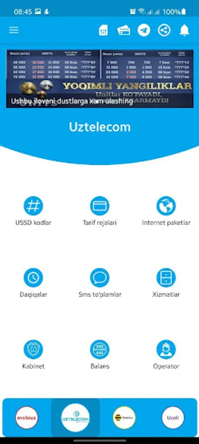 Ushbu ilova sizga 4 aloqa kompaniyalarining (Ucell, Beeline, Mobiuz, UzTelecom) barcha turdagi xizmatlarini (Tariflar, Internet, Sms, Daqiqalar, Ussd) taqdim etadi.