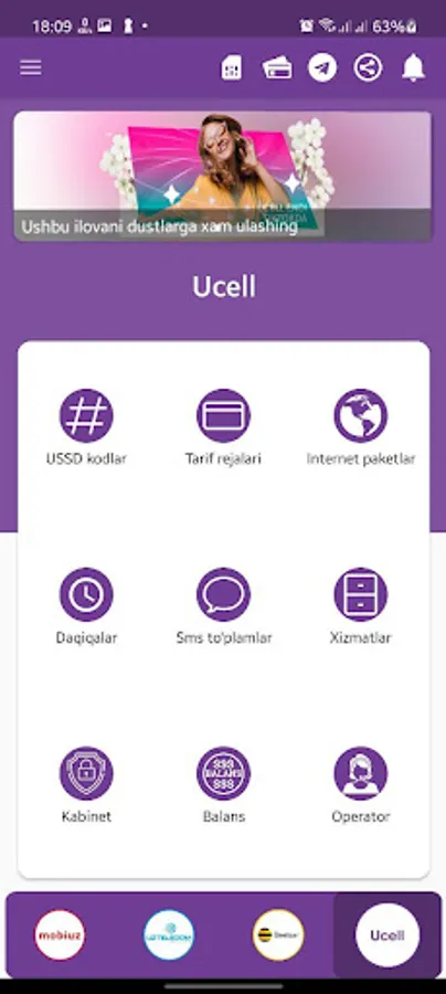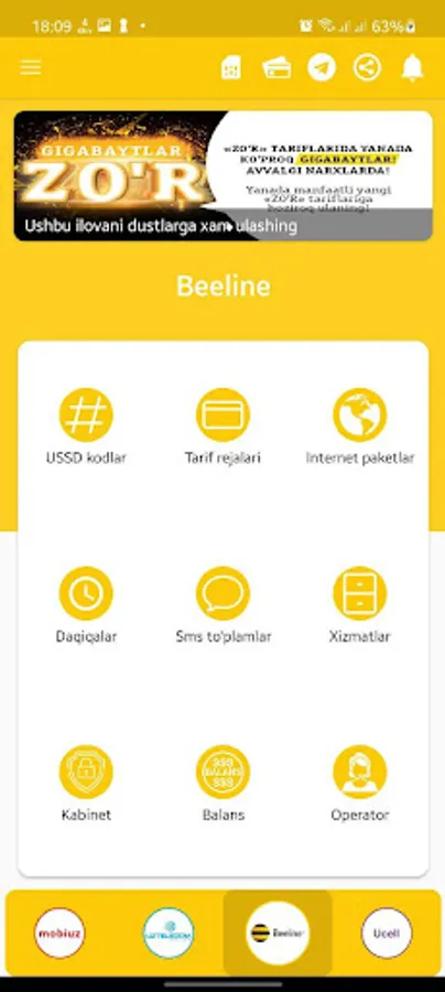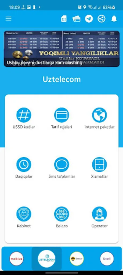 Ushbu ilova sizga 4 aloqa kompaniyalarining (Ucell, Beeline, Mobiuz, UzTelecom) barcha turdagi xizmatlarini (Tariflar, Internet, Sms, Daqiqalar, Ussd) taqdim etadi.