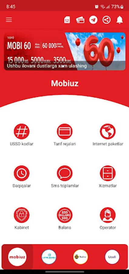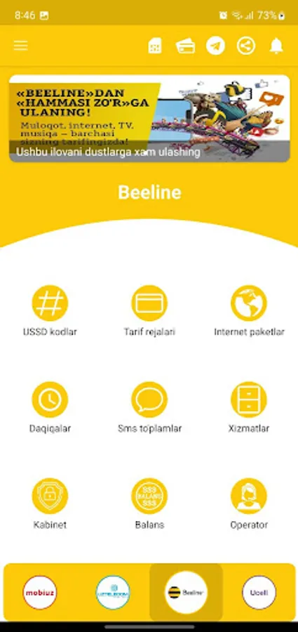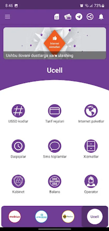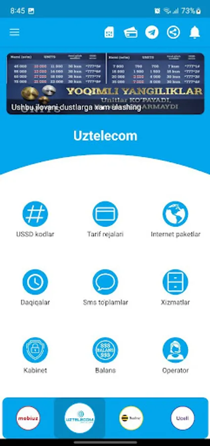 Ushbu ilova sizga 4 aloqa kompaniyalarining (Ucell, Beeline, Mobiuz, UzTelecom) barcha turdagi xizmatlarini (Tariflar, Internet, Sms, Daqiqalar, Ussd) taqdim etadi.