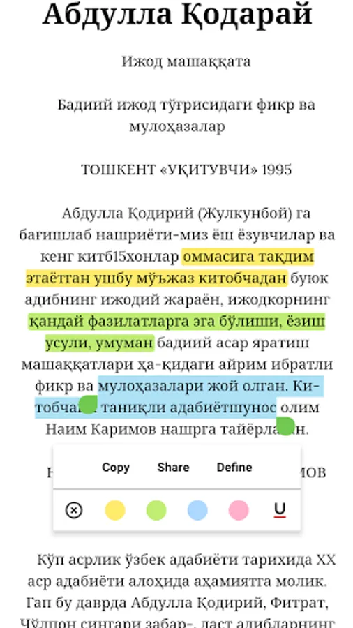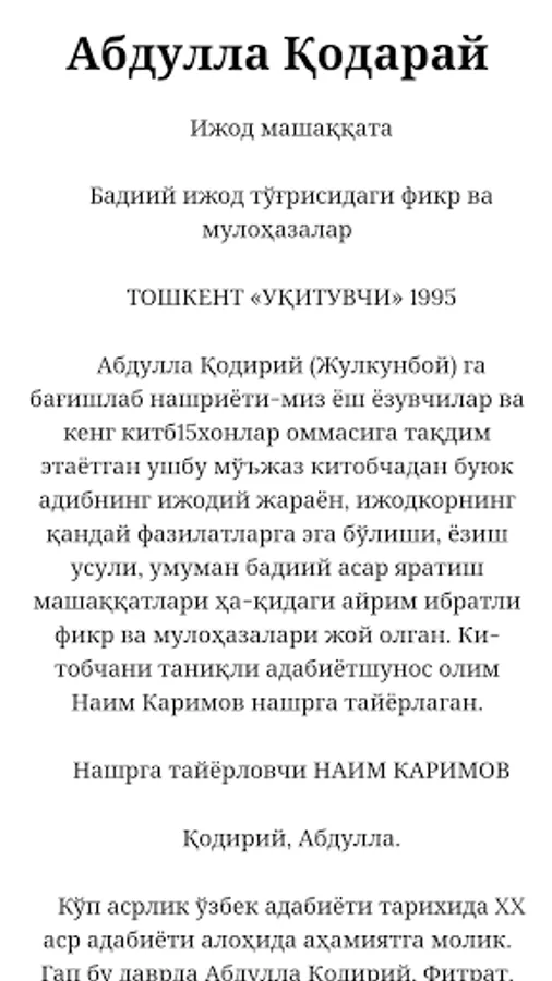 Abdulla Qahhorning ijodi 1924 yildan boshlangan. dastlab, "Mushtum" oynomasida, "Yangi Farg'ona" va "Qizil O'zbekiston" ro'znomalarida uning hikoya va fel'eton, xabarlari bosildi. Yozuvchining "Olam yasharadi" nomli birinchi hikoyalar to'plami 1938 yilda chop qilindi. 30-yillarda adibning "Hikoyalar" to'plamlari (1935, 1938, 1939) kitobxonlar qo'liga tegdi. Bu davrda Abdulla Qahhor kichik hikoyalardan tashqari "Sarob" (1935) romanini yozdi. Ulug 'Vatan urushi yillarida yozuvchining bir qancha fel'eton, ocherk va hikoyalari e'lon qilindi.