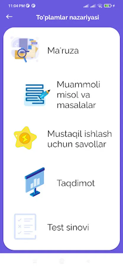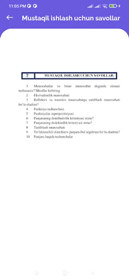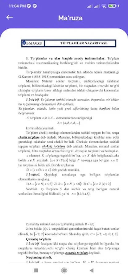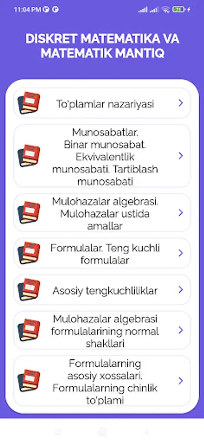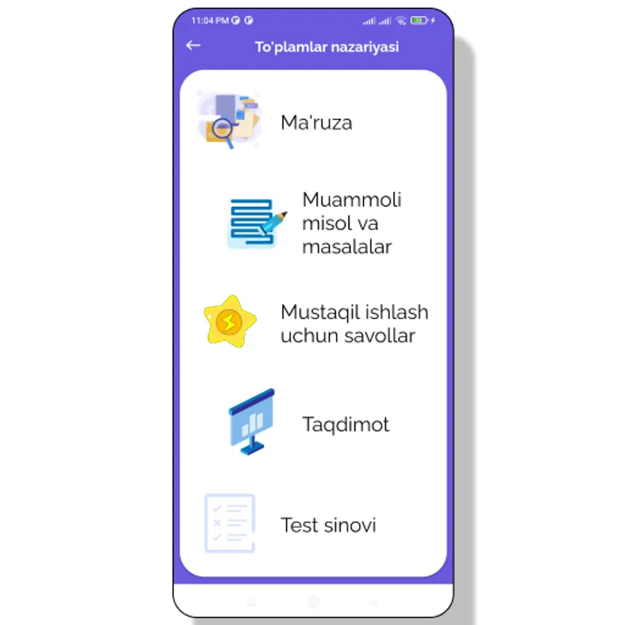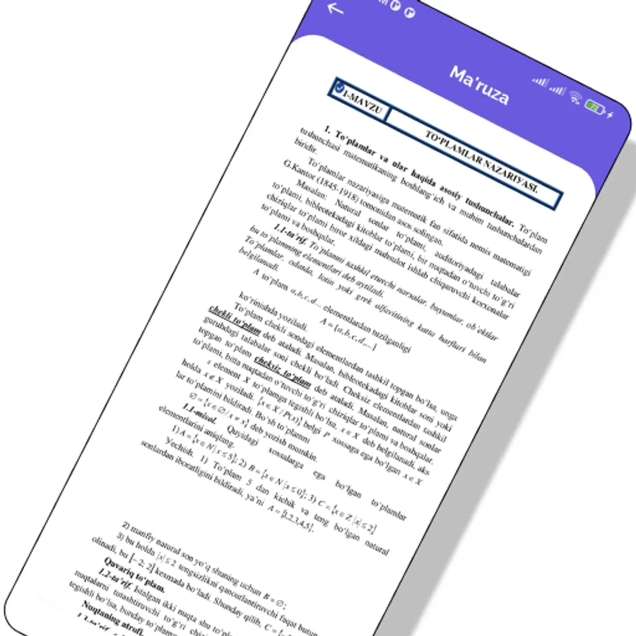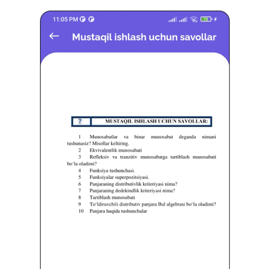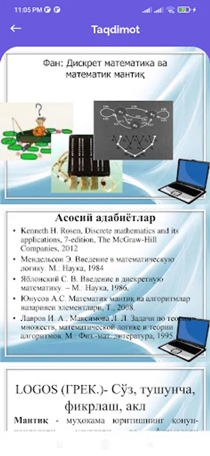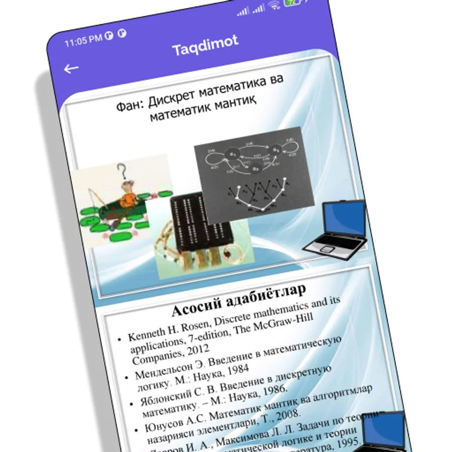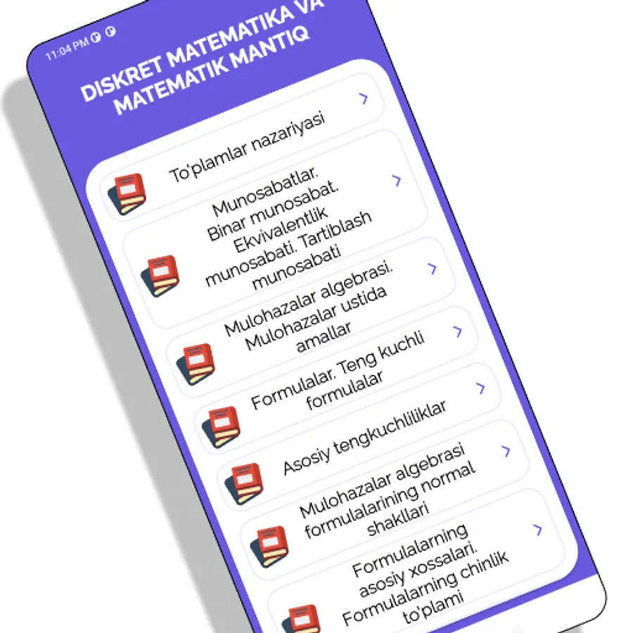 Ilovada "Diskret matematika va matematik mantiq" faniga doir ma'ruza matnlari, muammoli misol va masalalar, mustaqil ishlash uchun savollar, taqdimotlar hamda test sinovlari mavjud bo'lib, OTM talabalari uchun mukammal qo'llanma vazifasini o'taydi.