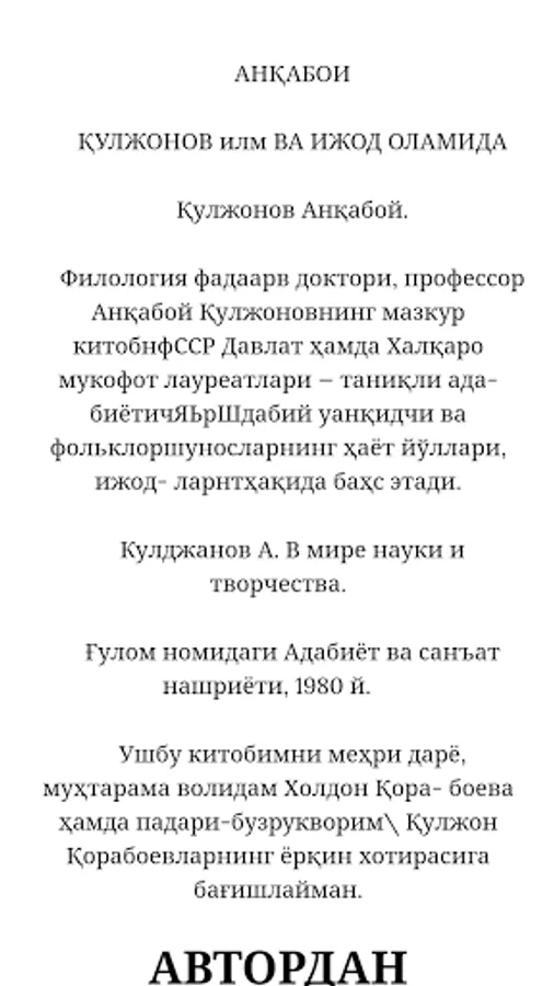 Assalomu alaykum ilm sevar aziz foydalanuvchi . Ijod olamida porlab turgan yangi bir kitob ‘’ilm va ijod olamida’’ni qarshi oling . Alisher Navoiy , Zahiriddin Muhammad Bobur , amir Temur kabi buyuk allomalarimizning hikmatli so’zlari bilan boyitilgan ushbu kitob ilmsevar yurtdoshlarimiz uchun ajoyib ilmnuri qo’llamma . Kitoblar olamiga sayohat qilarsiz ushbu kitob siz albatta o’qishingiz kerak bo’lgan kitoblar orasida ekanini unutmang. Ajdodlarga munosib avlod bo’lish barchamizning burchimiz. vatanimiz taraqqiyotida uchun qo’shayotgan hissamiz esa hamma uchun foydali bo’lishi zarur . Ushbu kitobni o’qing va yanada ko’proq hayotda as qotuvchi bilimlarga ega bo’ling . Shoir va praggrammistning mexnatiga baho berish edan chiqmasin.
