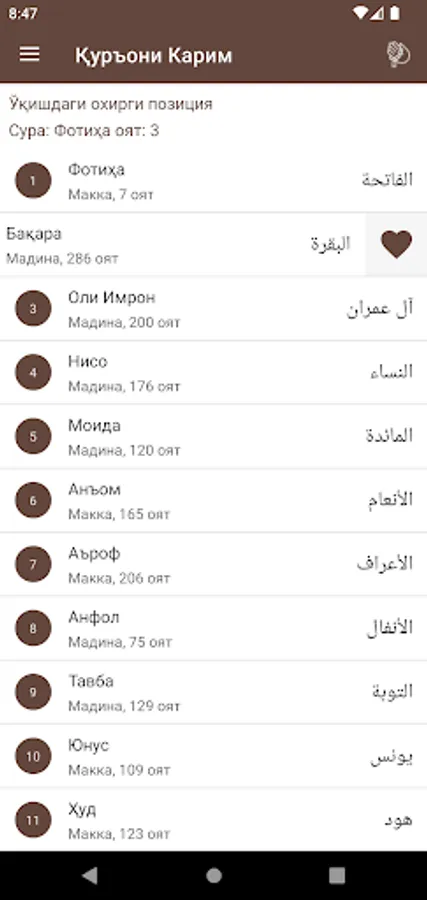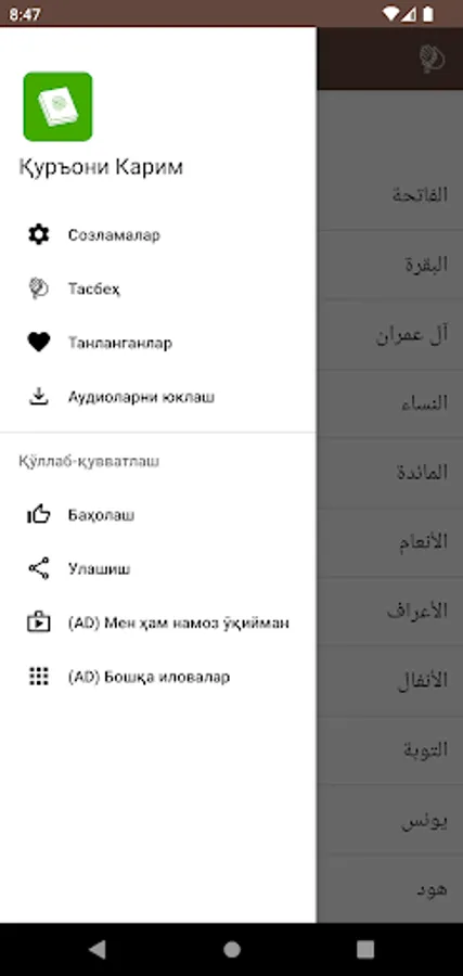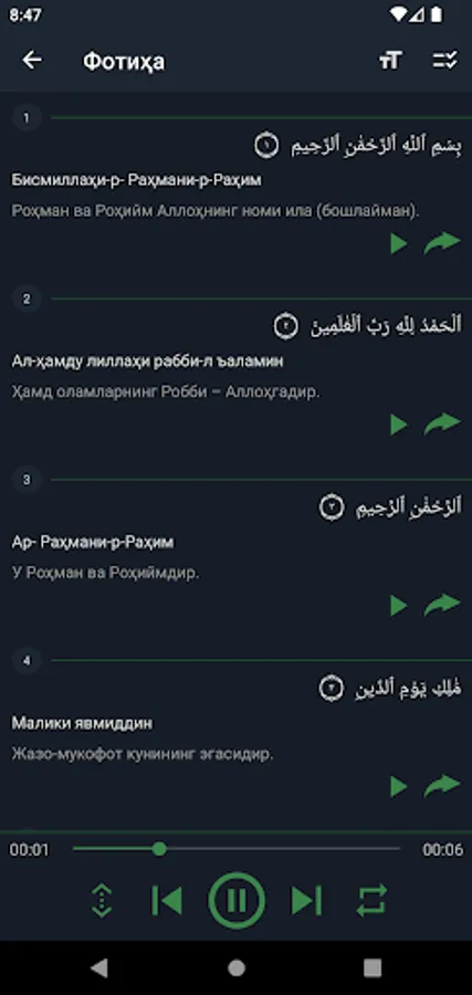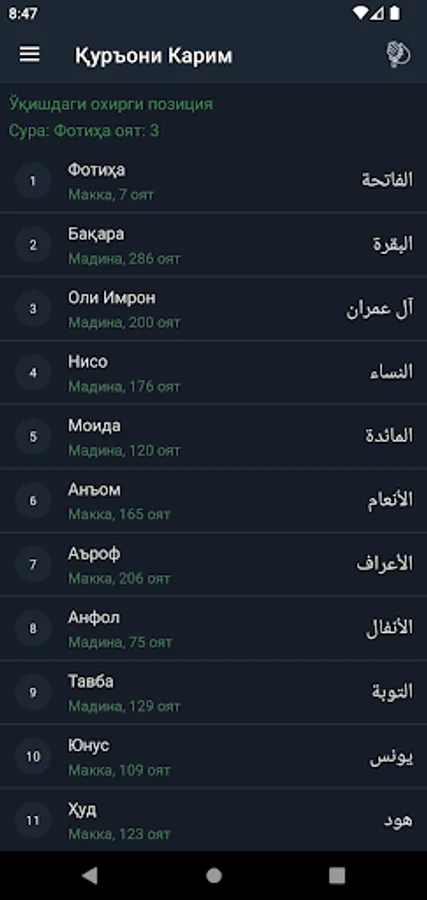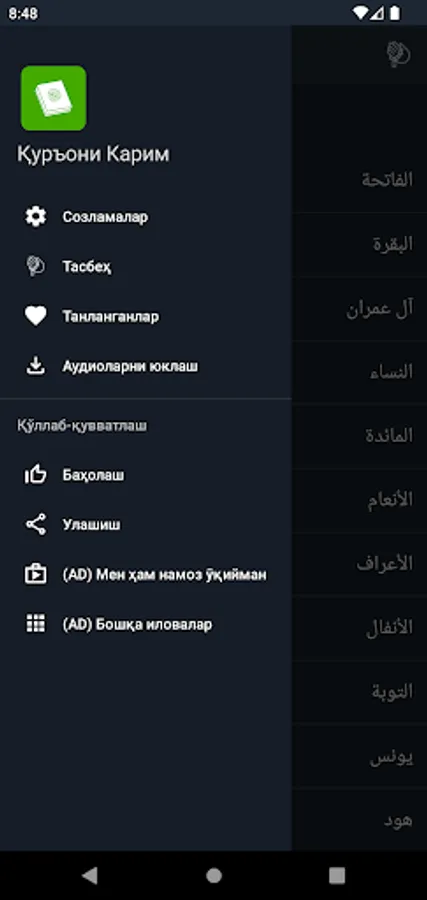 Kuroni Karim dasturi 114 suradan iborat bўlib, Ҟқish uchun zhuda қulai, kechayu kunduz tartibi ҳam mavzhud. Dastur arabic matn, Cyrillic transcription va tozhikcha, Ruscha, Uzbekcha kirilcha va lotincha Uzbekcha tarzhimalari bilan taқdim ethyldi. Matnlar katta yoki kichik, kurinadigan yoki kurinmas holga keltirilish mumkin. Sevimli surani ham sevimlilar ruykhatiga kiritish mumkin. Ohirgi ўқish position and dasturda qayd etiladi. Dasturmizga tasbeh va zikrlar ham kiritildi.