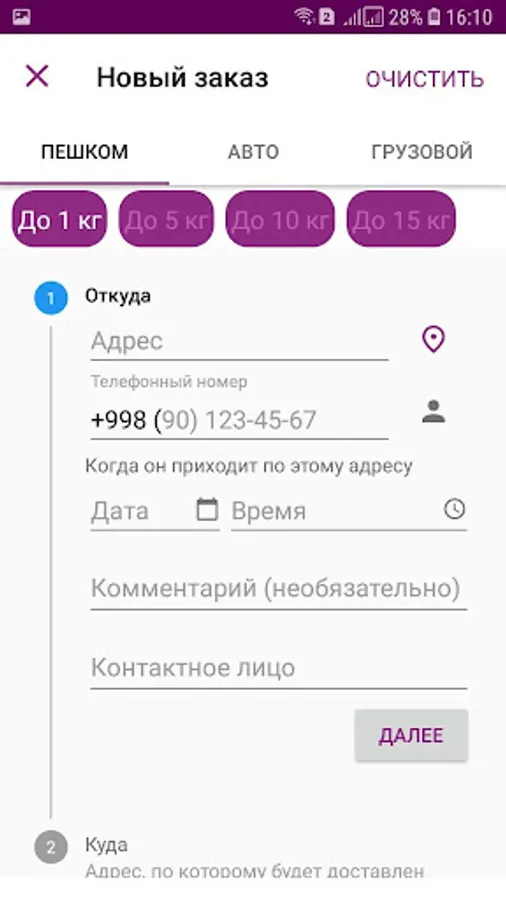 "Auto" courier - delivery of auto parts, boxes and other goods weighing no more than 30 kg.