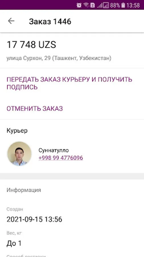 • Kuryer kelganida, buyurtmani kuryerga topshiring va sizdan junatmani olish uchun kuryerga telefoningizga imzo qo'yishini so'rang.