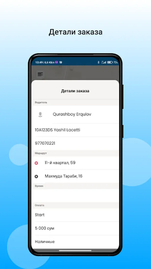 На вашем экране всегда полная информация о заказе: время подачи, имя водителя, марка, цвет и номер автомобиля.
