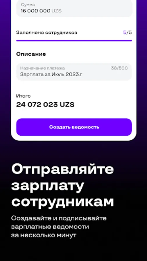 Create a payroll, fill in the payout amounts and sign the payment. Salaries will be credited to employees on the same day.