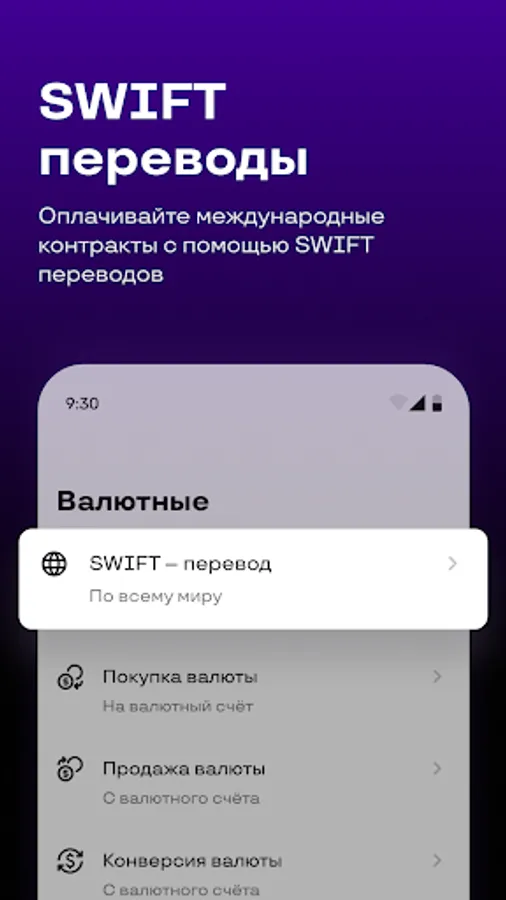 Send swift transfers, exchange currencies and view information about currency contracts.