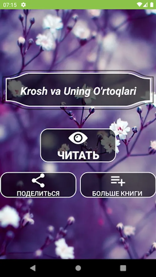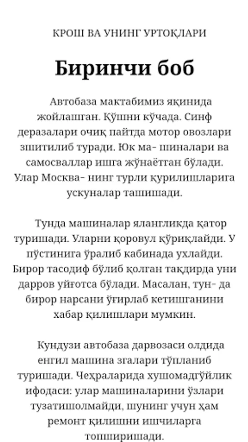 Chet el adabiyotiga mansub qiziqarli, sarguzashtga boy yangi ushbu asarda haqiqaiy do'stlikka katta e'tibor berilgan. Ushbu asarni yoshlikning beg'ubor damlari, yoshlikdagi qiziqarli o'yinlar, g'aroyib mashinalar olamini bir lahza yodga olasiz. Mo'jizaga, qiziqarli sarguzashtlarga boy bolalik davrida bo'lgan Krosh va uning do'stlarini yangidan yangi sarguzashtlarini bizning dasturimiz orqali o'qing.