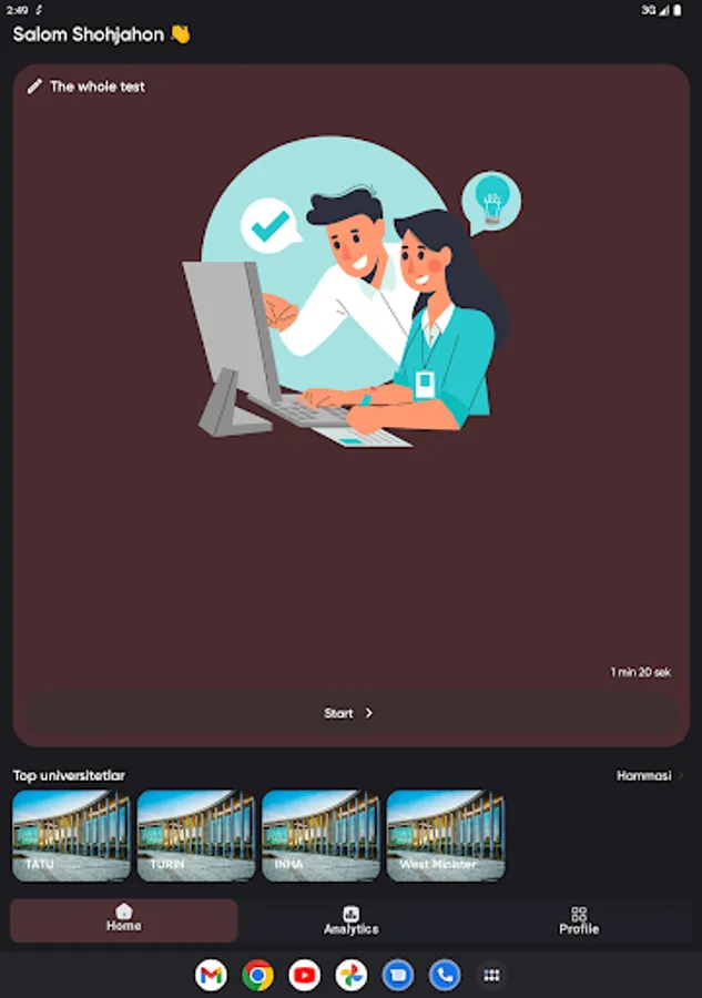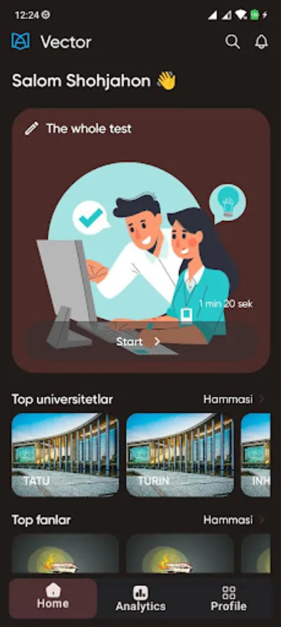 Siz VectorUz yordamida imtihon savollariga tayyorlanishingiz, o`zingizni natijalaringizni monitoring qilishingiz va natijalaringizdan kelib chiqqan holda o`zingizga mos Universitet topish imkoniyatiga ega bo`lishingiz mumkin!
