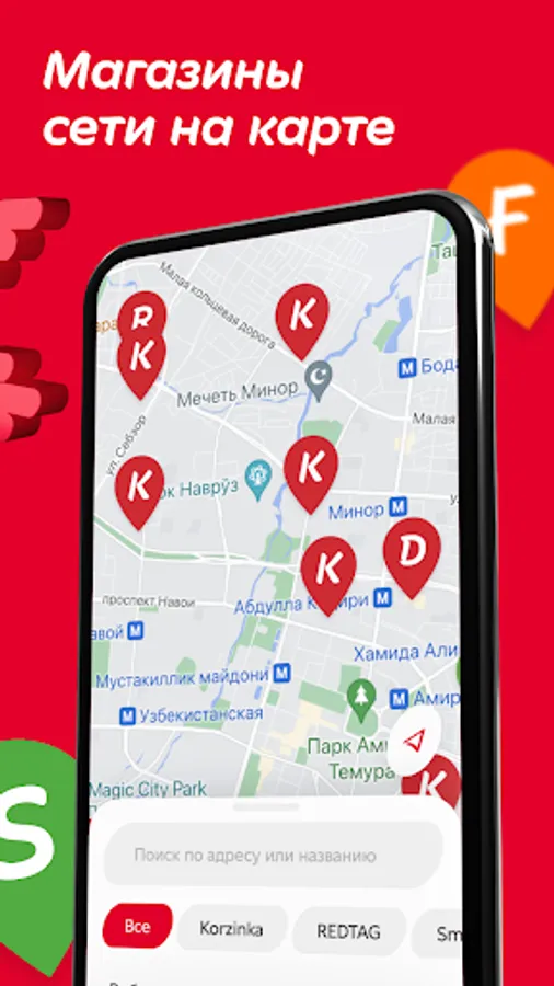 We will help you find the nearest Korzinka, no matter where you are: we will select the addresses of supermarkets near you, show you the opening hours and suggest the shortest route.