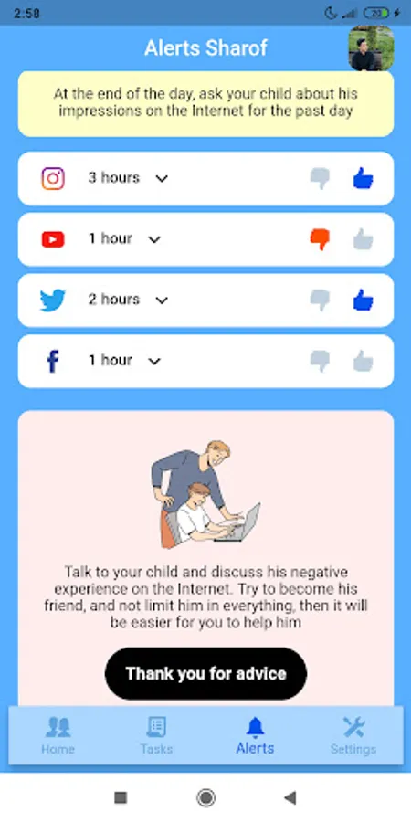 С помощью этого приложения вы можете ставить детям ежедневные задачи и контролировать их прогресс. Вы также можете контролировать и оценивать, сколько часов в день ваши дети проводят в социальных сетях. Мы надеемся, что вы найдете наше приложение полезным. С уважением, Шароф (создатель приложения).
