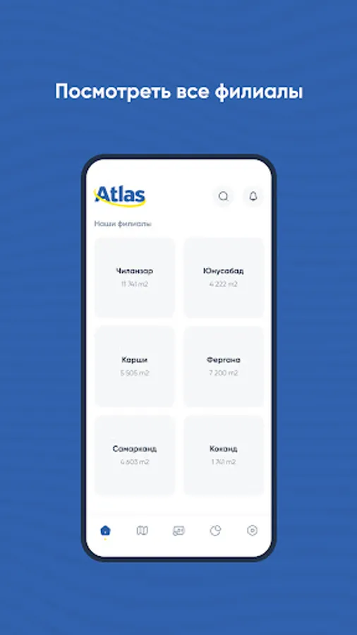The total number of Atlas malls has 9 branches. Among them: Atlas "Koratosh", Atlas "Chilonzor", Atlas "Ts5", Atlas "Maxim Gorky" is included in the Atlas "Rohat", Atlas "Sergeli", Atlas "Karshi", Atlas "Samarkand", Atlas "Fergana".