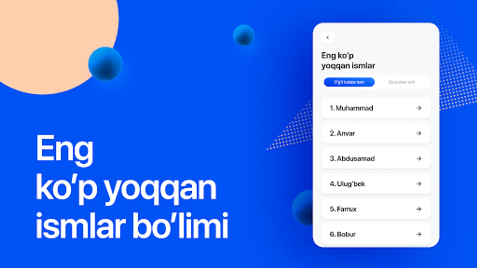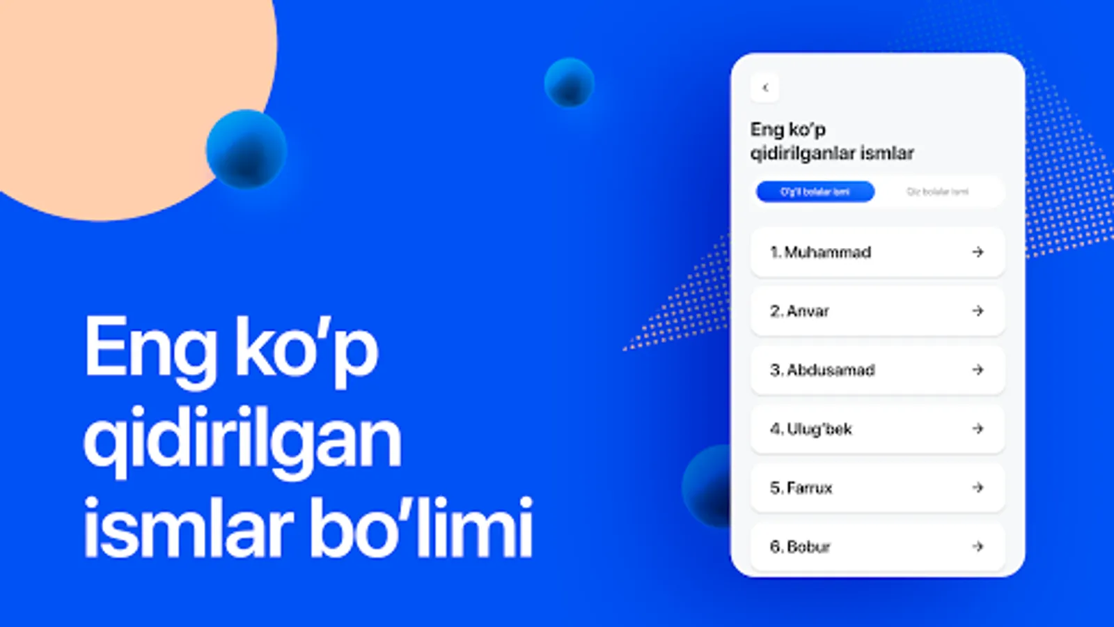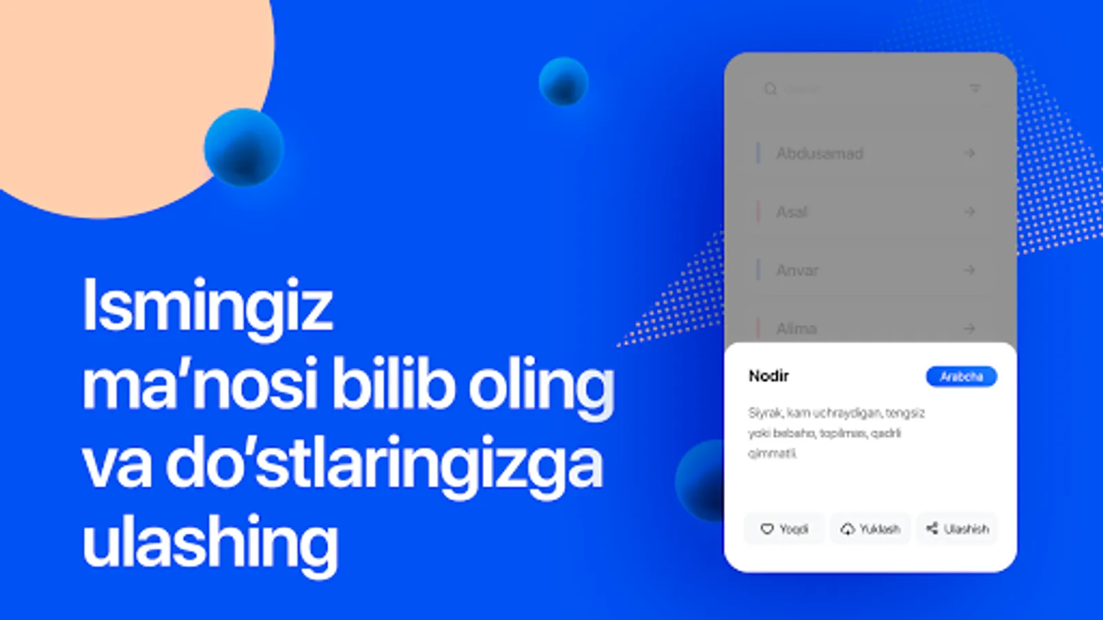 Learn the full meaning of the names of yourself and your loved ones in Uzbek through a beautifully designed and easy-to-use application: