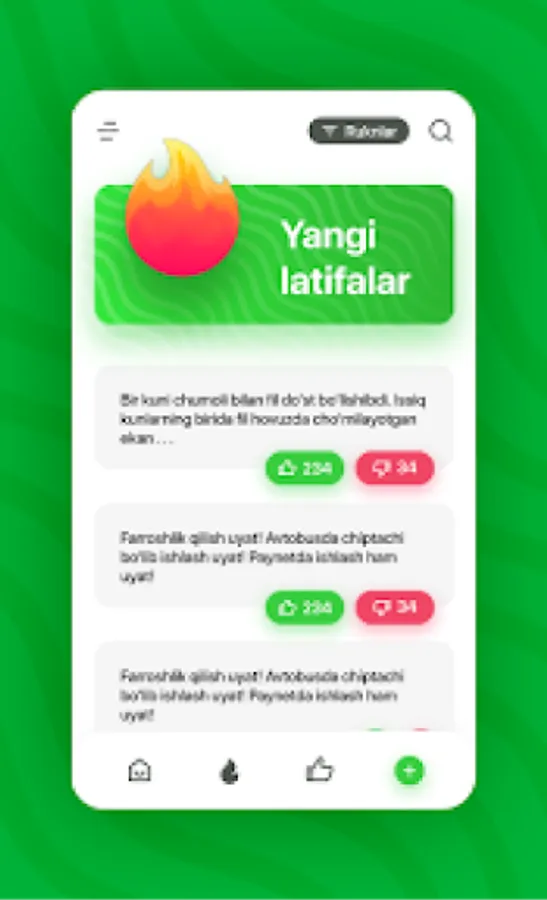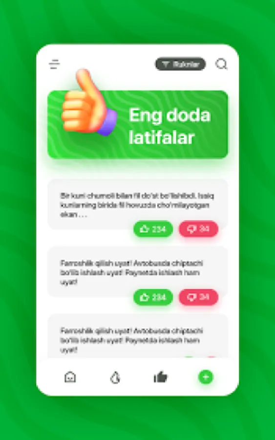 Latifa.uz - every day we present new and interesting jokes and jokes. The best jokes on various topics: couple, lovers, friends, work, market, drivers, teachers, doctors, March 8, new year, football, effendi and many other jokes are the first to appear in our application. You will have a good time, you can easily warm up the circle by telling our jokes in a circle of friends, teahouses and conversations. Funny pictures and humorous dialogues on difficult topics will not leave you indifferent.