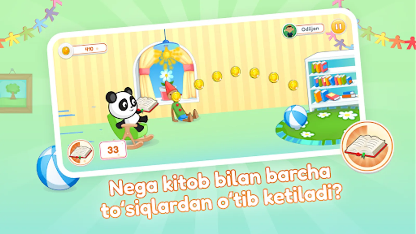 O'yindagi panda personaji orqali farzandingiz ham o'ynab turli xil foydali bilimlarga ega bo'ladi.