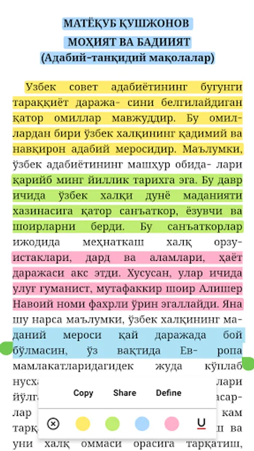 O'zbek sovet adabiyotining bugungi taraqqiyot daraja-sini belgilaydigan qator omillar mavjuddir. Bu omillardan biri o‘zbek xalqining qadimiy va navqiron adabiy merosidir. Ma'lumki, o‘zbek adabiyotining mashhur obidalari qariyb ming yillik tarixga ega. Bu davr ichida o‘zbek xalqi dunyo madaniyati xazinasiga qator san'atkor, yozuvchi va shoirlarni berdi. Bu san'atkorlar ijodida mehnatkash xalq orzu-istaklari, dard va alamlari, hayot darajasi aks etdi. Xususan, ular ichida ulug‘ gumanist, mutafakkir shoir Alisher Navoiy nomi faxrli o‘rin egallaydi. Yana shu narsa ma'lumki, o‘zbek xalqining madaniy merosi qay darajada boy bo‘lmasin, o‘z vaqtida Yev- ropa mamlakatlarijuda ko‘plab nusxalarda kitob chop qilish ishlari yo‘lga qo‘yilmaganligidan, adabiy asarlar mehnatkash xalq orasida juda kam tarqalgan. Adabiy merosni o‘rganish va uni xalq ommasi orasiga tarqatish, asosan, Oktyabr sosialistik revolyusiyasidan keyin boshlandi. Shu kunlarda o‘zbek shoir va yozuvchilarining ijodlari har xil shaklda, ba'zan alohida to‘plamlar, ba'zan tanlangan asarlar ba'zan esa to‘la to‘plamlar shaklida ham o‘zbek tilida, ham rus tilida nashr qilinib turibdi. Alisher Navoiyning alohida asarlarining nashridan tashqari rus tilida o‘n tomligi, o‘zbek tilida o‘n besh tomligi chop qilindi. Hozir esa bu ulug‘ gumanist shoirning yigirma tomdan iborat to‘la asarlar to‘plami nashrga tayyorlanyapti.