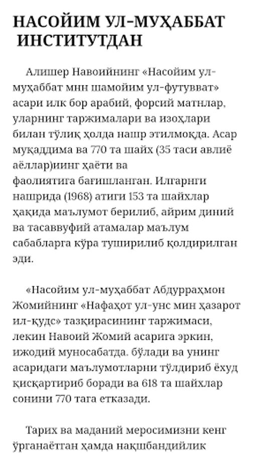 Alisher Novoiyning Nosoimul muxabbat kitobi endi yangi talqinda ushbu kitobda Alisher Novoiy muxabbatning xam g'amgin kayg'uli tomonlarini qanchalik yoritib bergan bo'lsa shunchali sevgining qanchalik kit baxt ekanorligi'i sevgining qanchalik kit baxt ekanligi , rivoyatlarini, g'azalarini jam etgan sevgi uchun inson nimalarga qodir va chin sevgini kuchi haqida chuqur manoga ega. Ushbu kitob o'z ichiga vatanga bo'lgan ota onaga bo'lgan muxabbat tuyg'ularini xam qamrab olgan sizga yoqimli mutolaba tilab qolamiz.