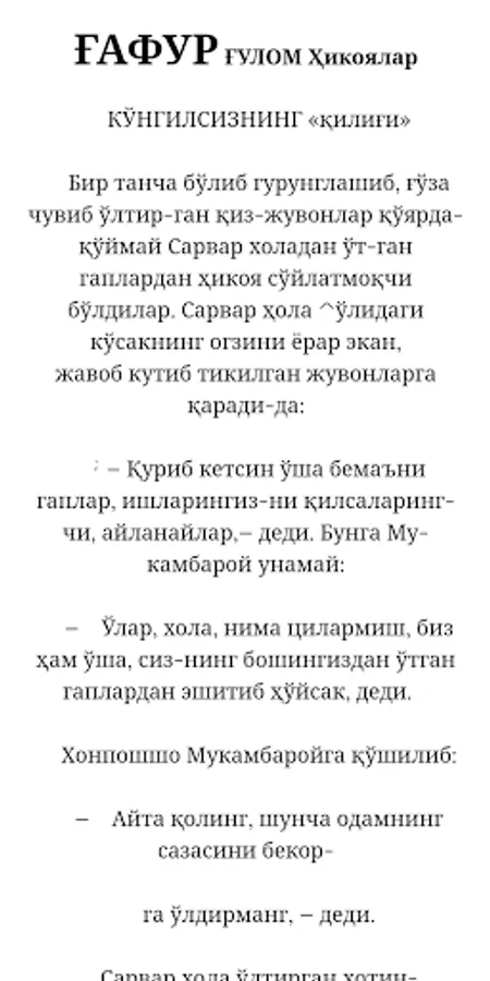 G'afur G'ulom o'zbek tarjima maktabining maydonga kelishiga ham ulkan hissa qo'shgan. U "Otello", "Qirol Lir" singari jahon adabiyoti durdonalarini ^ o'zbek tiliga katta mahorat bilan o''girgan. G'afur G'ulom O'zbekiston Fanlar akademiyasining haqiqiy a'zosi (1943) edi. U 60 yillik yubileyi munosabati bilan "O'zbekiston xalq shoiri" faxriy unvoniga sazovor bo'lgan (1963). 2000 yilda esa Vatan oldidagi unutilmas xizmatlari uchun unga "Buyuk xizmatlari uchun" ordeni berildi. O'zbek she'riyatining otashin jarchisi, ulkan so'z san'atkori G'afur G'ulom milliy adabiyotimizning rivojiga katta hissa qo'shgan Hikoyalar - Xurshid Davron kutubxonasi.