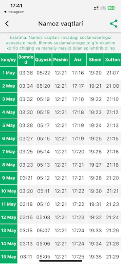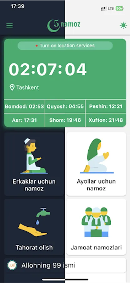 Namoz vaqtlari bo'limidan sizning turgan joyinggizga nisbatan siz uchun anniq vaqtlarni ko'rsatib beradi. Bundan tashqari dasturda yana namoz o'qishni videolarga qarab o'rganish bo'limi ham mavjud bo'lib, u orqali namoz o'qishni tez va to'g'ri o'rganib olishinggiz mumkin.