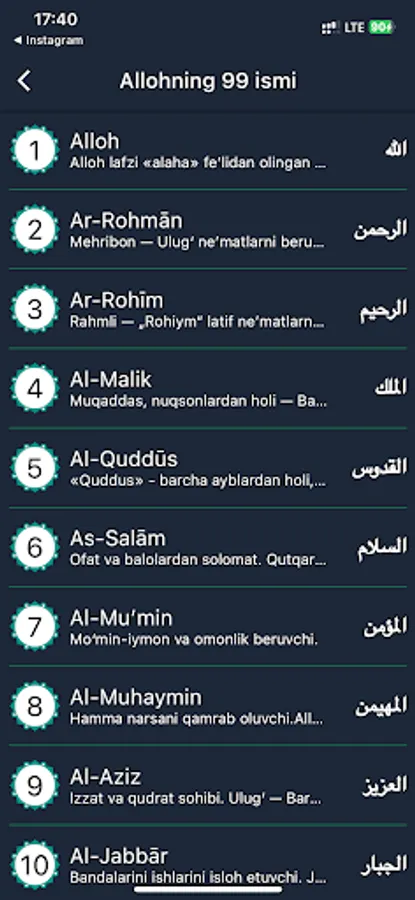 Allohning 99 ismi har kuni tasodifiy holatda sizga bildirib turadi. Bundan tashqari yana kunlik duolar va oyatlarni bildirishnoma orqali qabul qilib turishingiz mumkin.