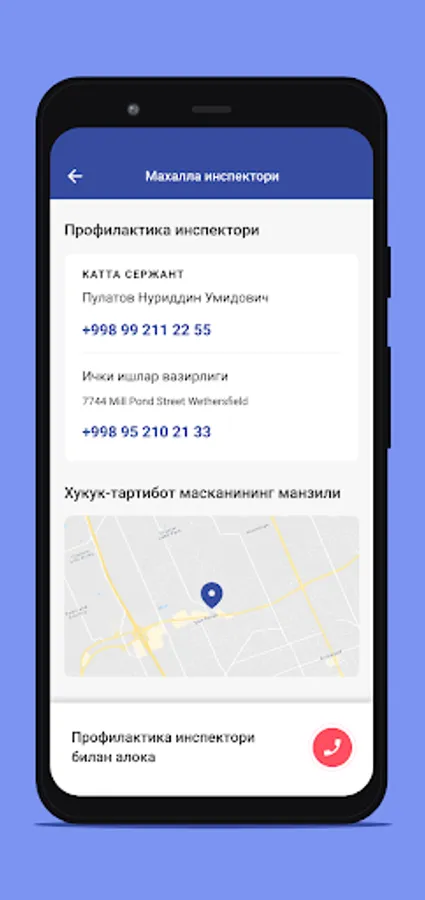 mahalla profilaktika inspektori haqidagi asosiy maʼlumotlar va huquq-tartibot maskanining geojoylashuvi, shuningdek profilaktika inspektoriga baho berish;
