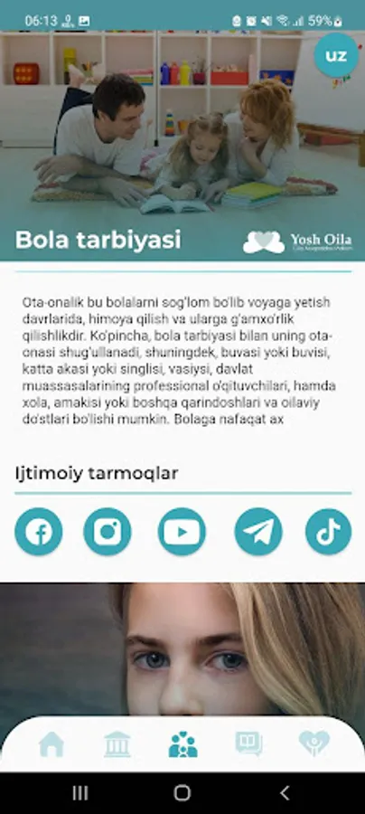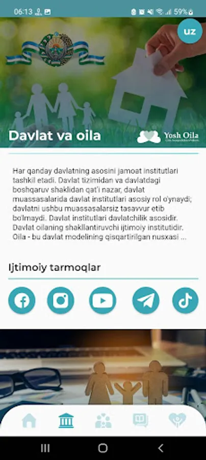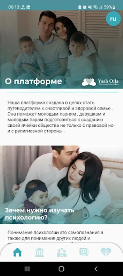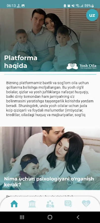 Bizning platformamiz baxtli va sog'lom oila uchun qo'llanma bo'lishga mo'ljallangan. Bu yosh o'g'il bolalar, qizlar va yosh juftliklarga nafaqat huquqiy, balki diniy tomondan ham jamiyatning o'z bo'linmasini yaratishga tayyorgarlik ko'rishda yordam beradi. Shuningdek, unda yosh oilalar uchun juda ko'p qiziqarli va foydali ma'lumotlar (imtiyozlar, kreditlar, oiladagi huquq va majburiyatlar, sog'liq va boshqa ko'p narsalar) mavjud.