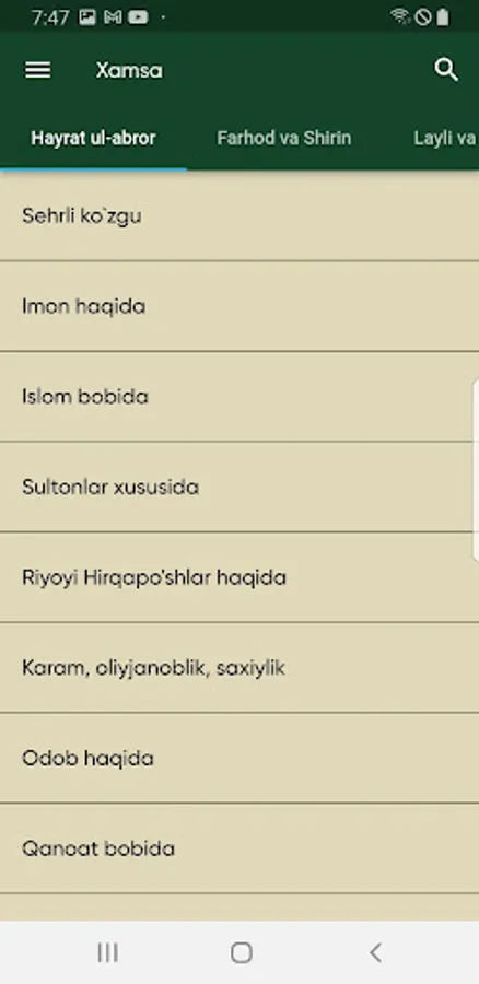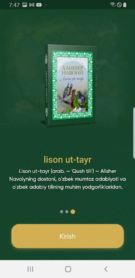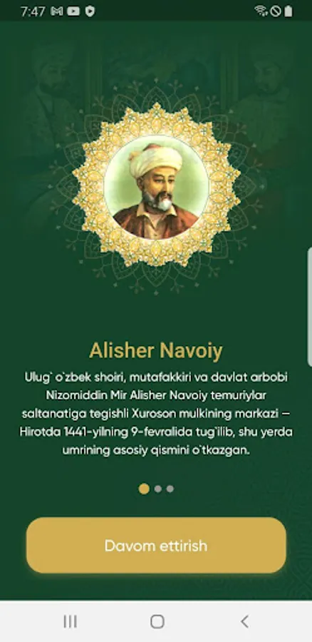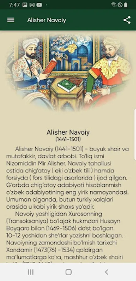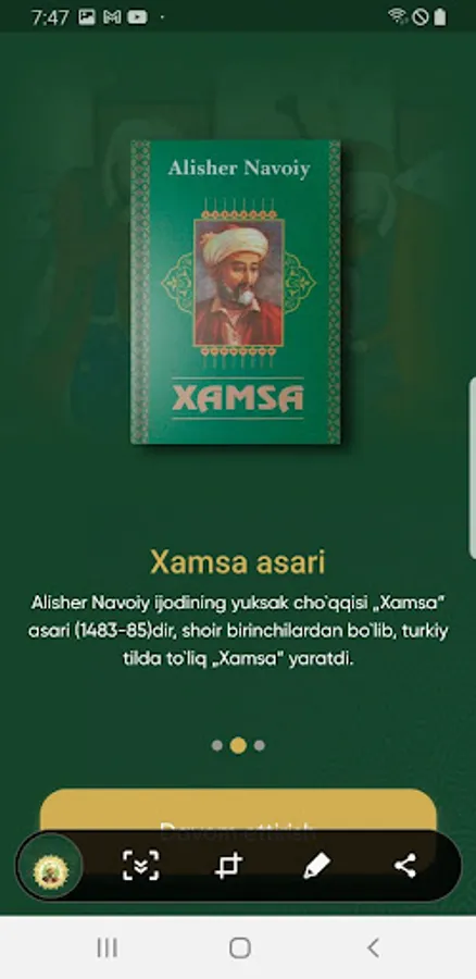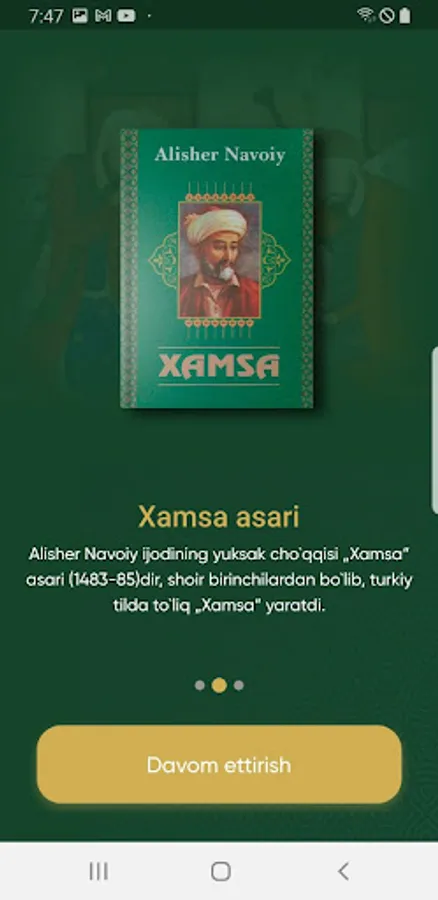 Mobil ilovaga kirgandan o`sha davr muhitini xis qilishi uchun osha davrning eng ommobob naqishlaridan foydalanganmiz. Mobil ilovadan foydalanayotganda Alisher Navoiyning siymosini tasavvur qilishi uchun uni rasmlaridan foydalanganmiz ranglar esa osha davrda judo ko`p foydalanilganligi uchun shu ranglar olingan. Qidirish funksiyasi, biz odamlarga o`zlari izlagan narsani tezro topishiga yordam berish uchun bu funksiyani qo`shdik. Ulashish funksiyasi orqali boshqa bir kitobxon bilan asarning ixtiyoriy tanlangan tanlangan qismini xohlagan ijtimoiy tarmoq ilovalari orqali ulashishingiz mumkin.