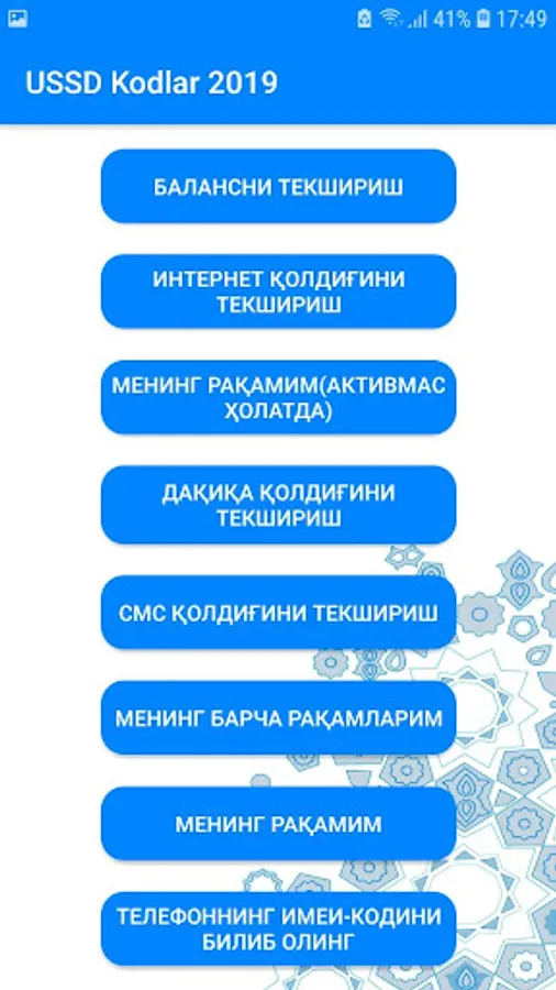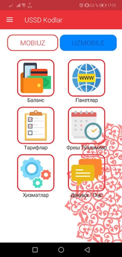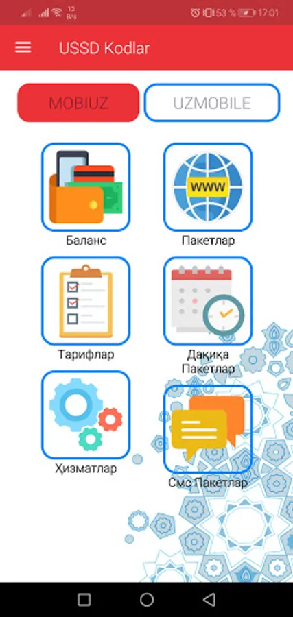 Balance tekshirish telephone, internet packarar qarid kilish, shimcha hizmatlarni yoқish yoki ўchirish uchun ussd sovlarar tўplami!