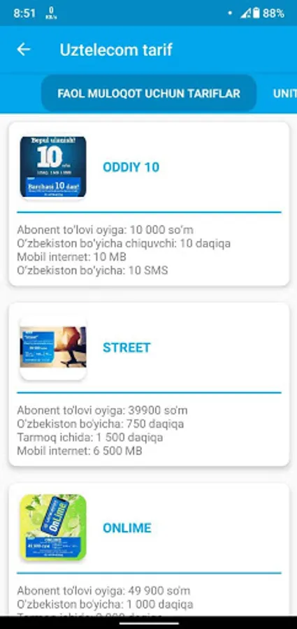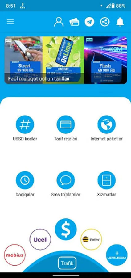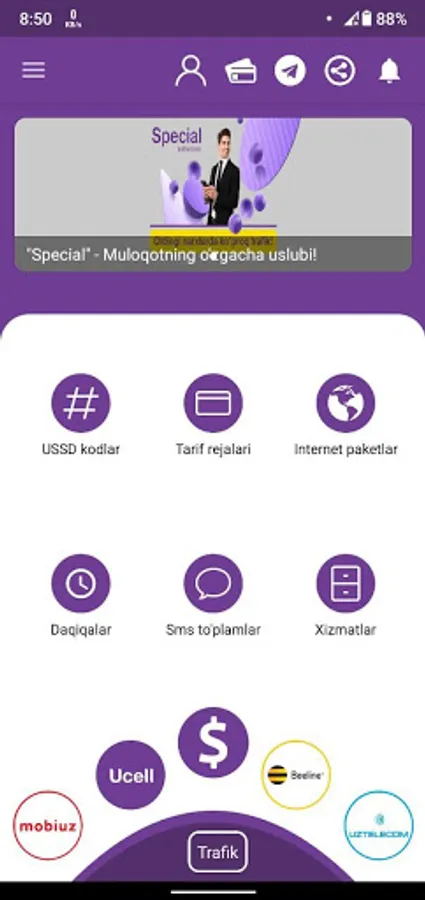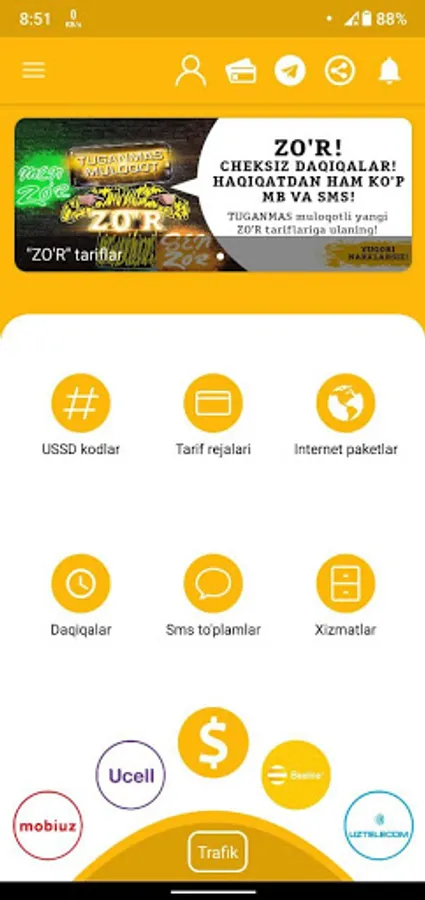Ushbu ilova sizga 4 aloqa kompaniyalarining (Ucell, Beeline, Mobiuz, UzTelecom) barcha turdagi xizmatlarini (Tariflar, Internet, Sms, Daqiqalar, Ussd) taqdim etadi.
