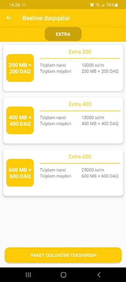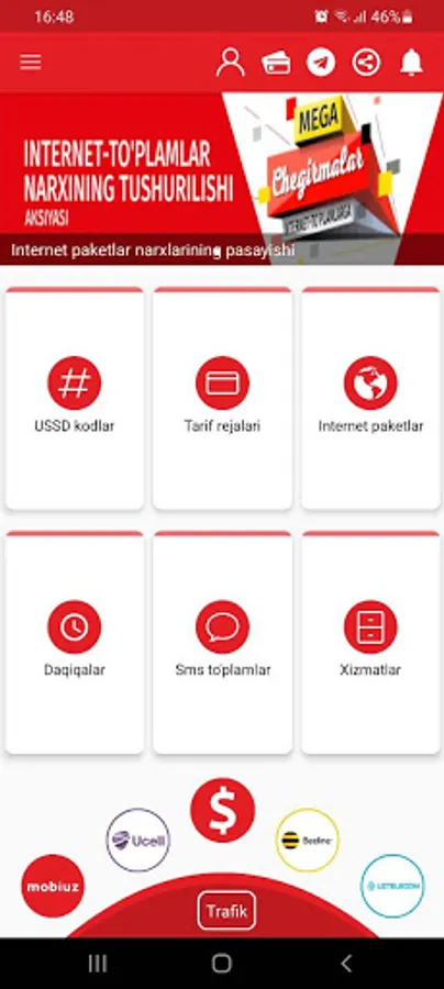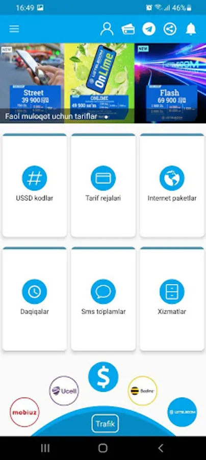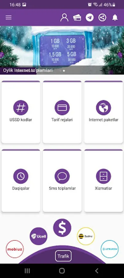 Endi Internet paketlar harid qilish, qo'shimcha xizmatlarni yoqish yoki o'chirish uchun USSD so'rovlarni jo'natishga hojat yo'q, shuningdek MobiUz, Uzmobile, Beeline, Ucell yangiliklaridan va aksiyalaridan birinchi bo'lib xabardor bo'lishingiz mumkin!