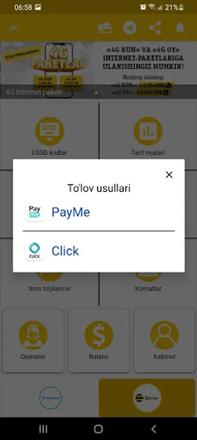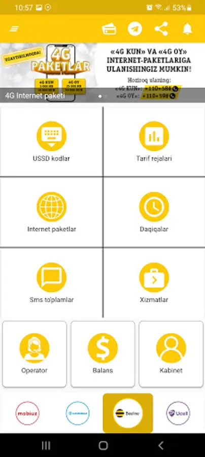 Endi Internet paketlar harid qilish, qo'shimcha xizmatlarni yoqish yoki o'chirish uchun USSD so'rovlarni jo'natishga hojat yo'q, shuningdek Uzmobile, Beeline, Mobiuz, Ucell yangiliklaridan va aksiyalaridan birinchi bo'lib xabardor bo'lishingiz mumkin!