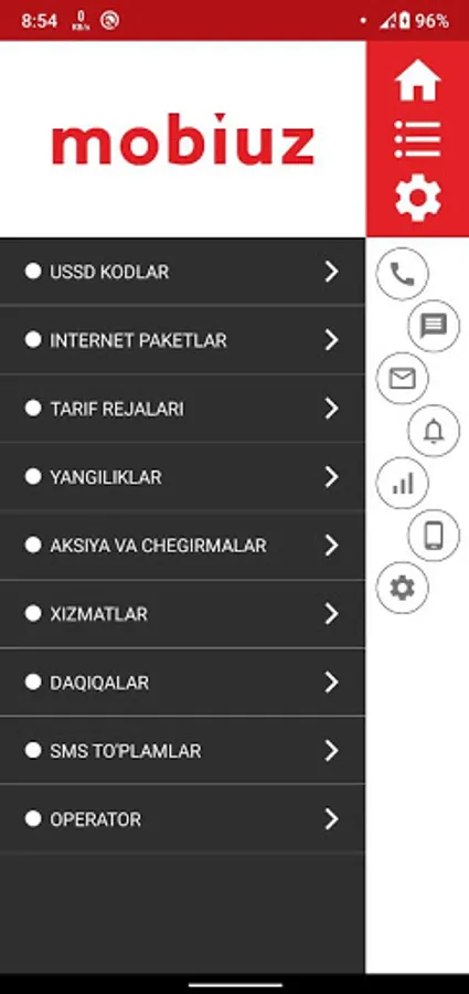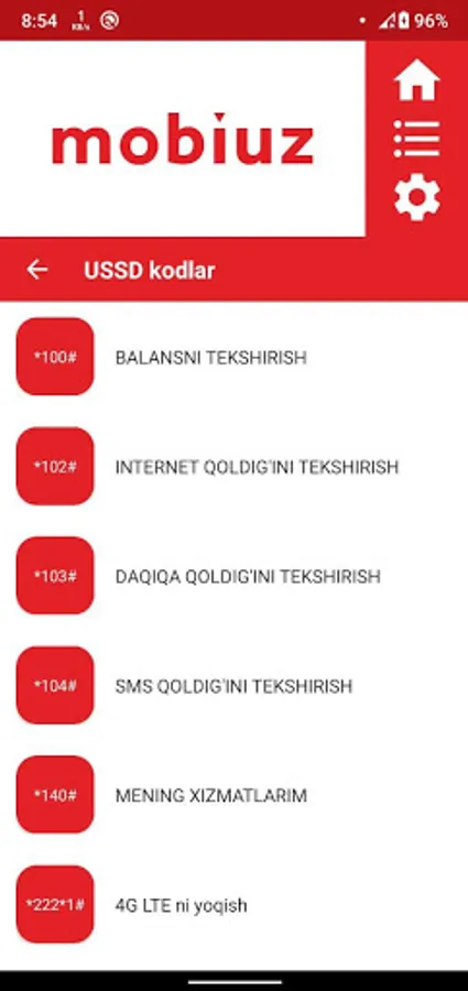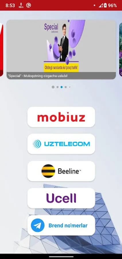 Ushbu ilova sizga 4 aloqa kompaniyalarining (Ucell, Beeline, Mobiuz, UzTelecom) barcha turdagi xizmatlarini (Tariflar, Internet, Sms, Daqiqalar, Ussd) taqdim etadi.