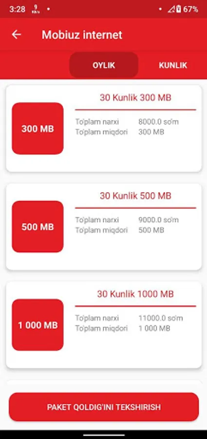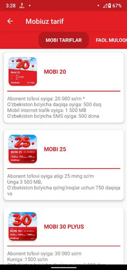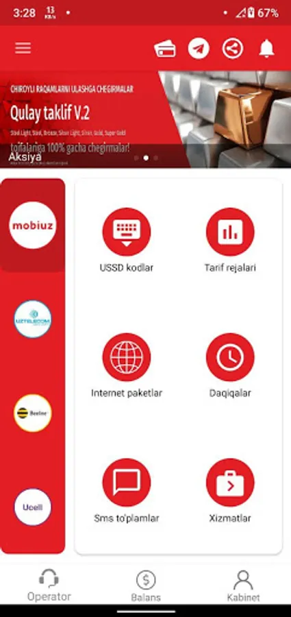 Ushbu ilova sizga 4 aloqa kompaniyalarining (Ucell, Beeline, Mobiuz, UzTelecom) barcha turdagi xizmatlarini (Tariflar, Internet, Sms, Daqiqalar, Ussd) taqdim etadi.