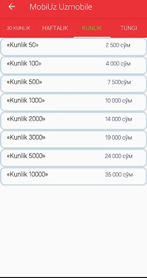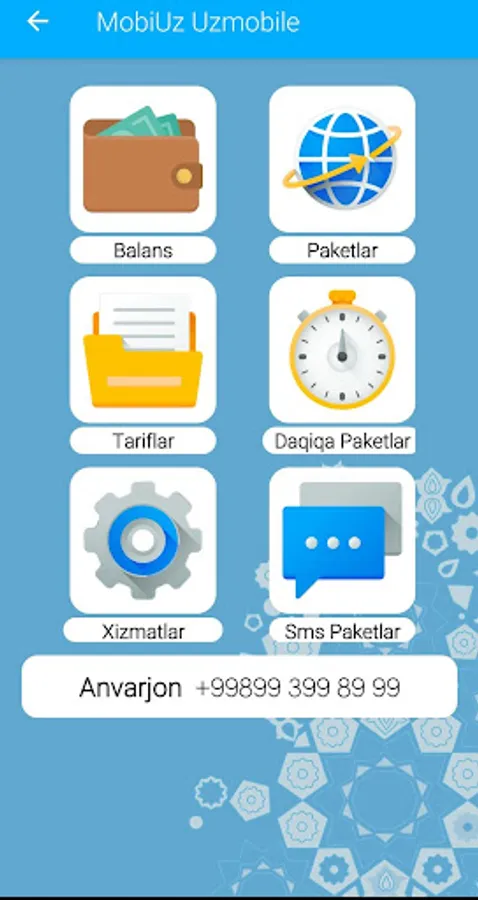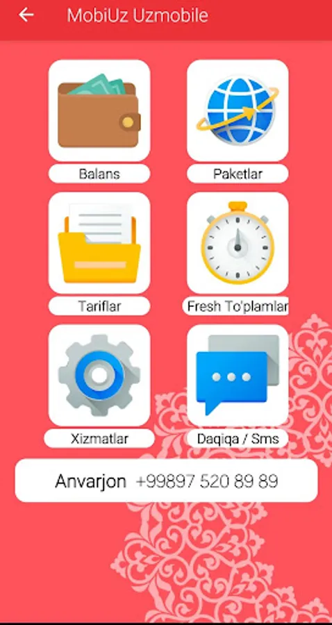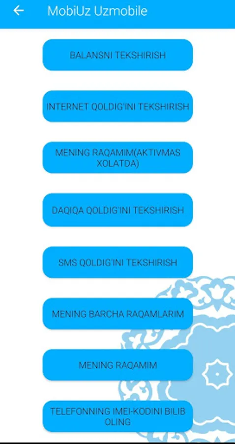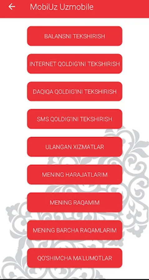 Balance tekshirish telephone, internet packarar qarid kilish, shimcha hizmatlarni yoқish yoki ўchirish uchun ussd sovlarar tўplami!