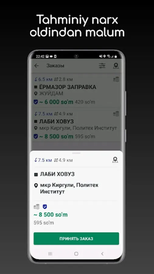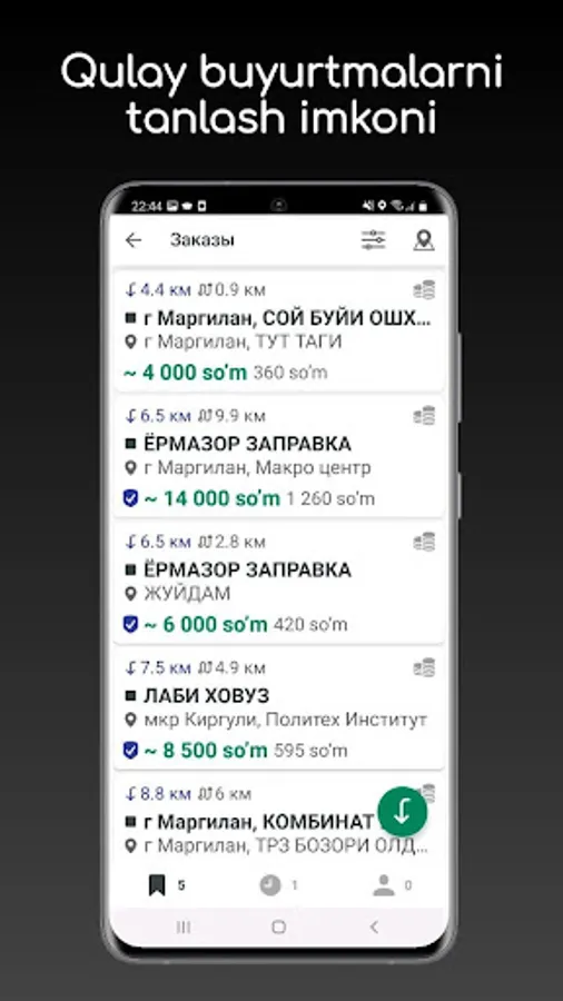 - tanlov bosqichida barcha mavjud buyurtmalar to'g'risida zarur ma'lumotlarni olish: etkazib berish manziligacha bo'lgan masofa, yo'nalish, tarif, buyurtma qiymati va haydovchi uchun buyurtma qiymati;