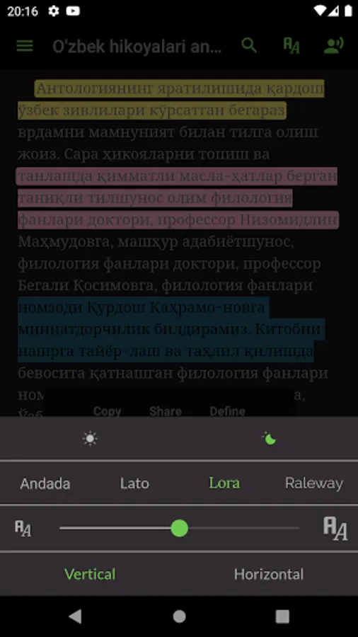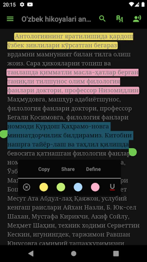 Turkiy tilargi boy adabiyotimizining bebaho hazinalaridan sanalmish o'zbek adabiyoti namunalari bilan yaqindan tanishish, qardosh O'zbekistonga kelgan biz kabi har bir turkiyalik uchun orzuga aylanadi. Ayniqsa, ajdodlarimiz ruhi ufurgan ona zaminda bir-ikki yil yashar ekanmiz, o'zbek yezuvchilari va shoirlarining asarlarini o'qish ish-tivqi bizda tobora kuchaya bordi. Xalq havtini kengroq va aniqroq ifodalagan hikoyalarni topib o'qishga harakat qil-dik. Ammo bu oson bo'lmadi, o'nlab hikoyalarni so'rab-surish-tirib topish, eng saralarini tanlab o'qish bizlardan katta hafsala va kuch-gayrat talab qildi. Bizga vrdamlashish ista-gida bo'lgan o'zbek zivlilarining ham hikoyalar antologiyasi yo'qligidan qiynalishavtganiny sezdik. O'zbek hikoyalari antologiyasini yaratish, bu xayrli ishni amalga oshirish uchun bor imkoniyatlardan foydalanishga qaror qildik.
