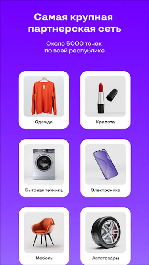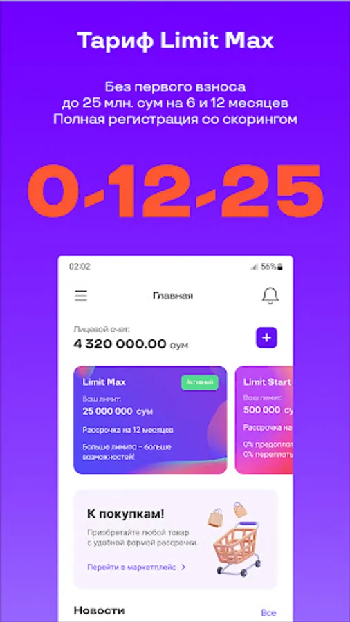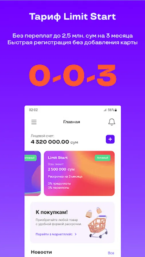 Sign up quickly on the website or app. All you need for this is a passport or an ID-card and a bank card. Further, instant access to the installment plan for the necessary goods and services throughout Uzbekistan will open with a limit of up to 25,000,000 soums.