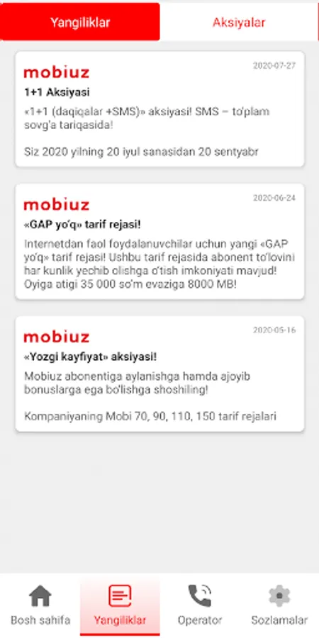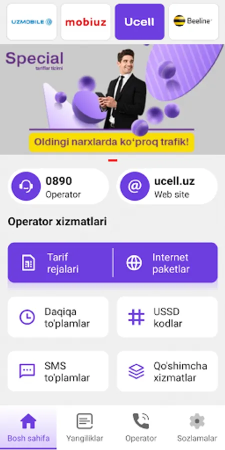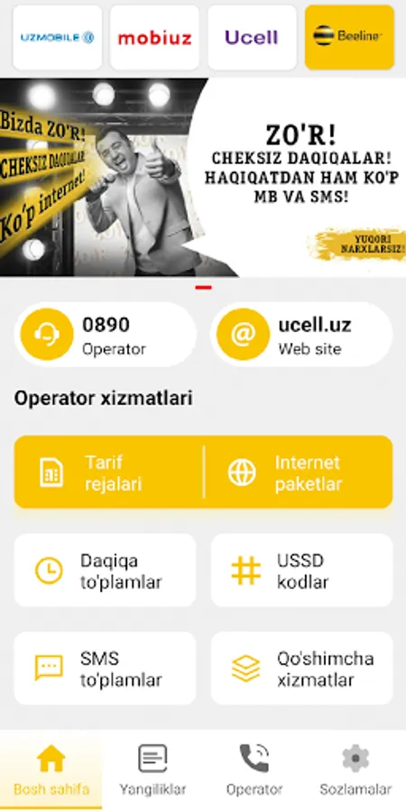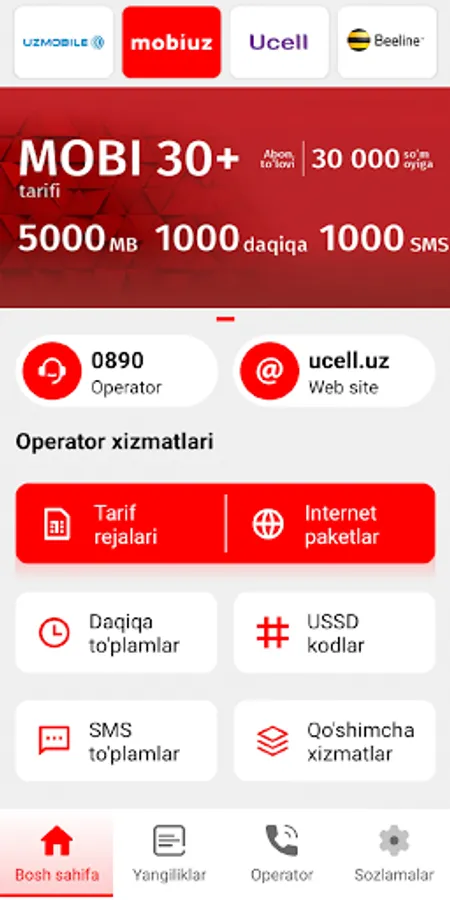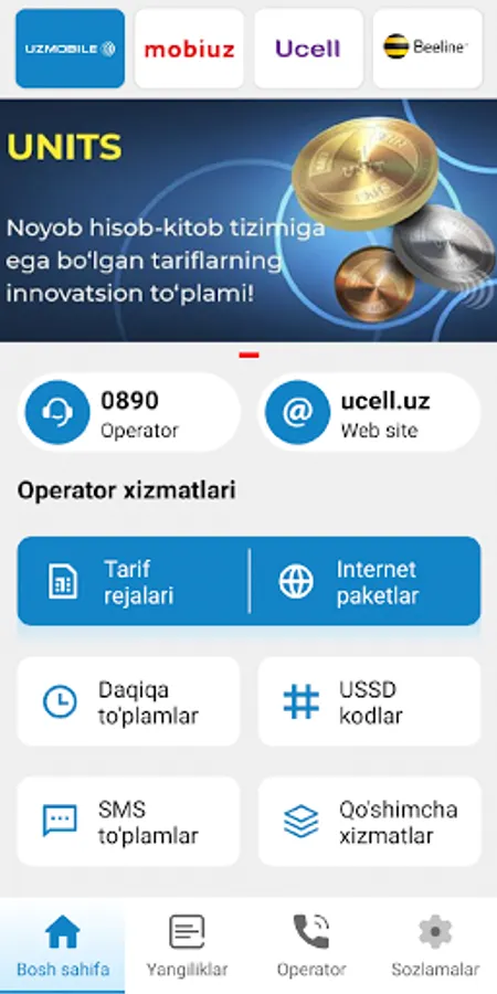 Dasturni o'rnatganingizdan so'ng O'zbekiston mobil aloqa operatorlari UMS Uzmobile Ucell Beeline va Perfectum haqida barcha savollaringizga javoblar olasiz va quyidagi imkoniyatlarga ega bo'lasiz:
