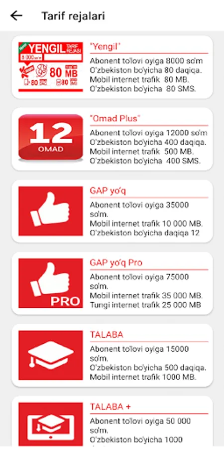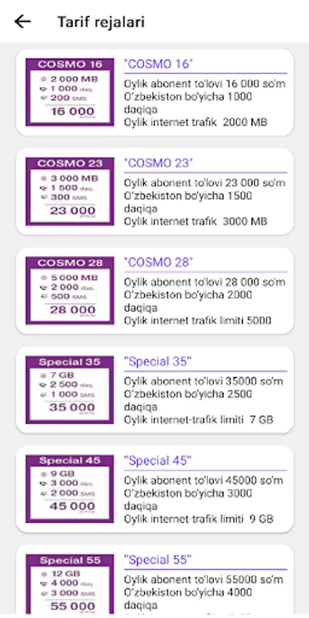 Xizmat narxi va tariflari haqida ma'lumotlar kerakmi?