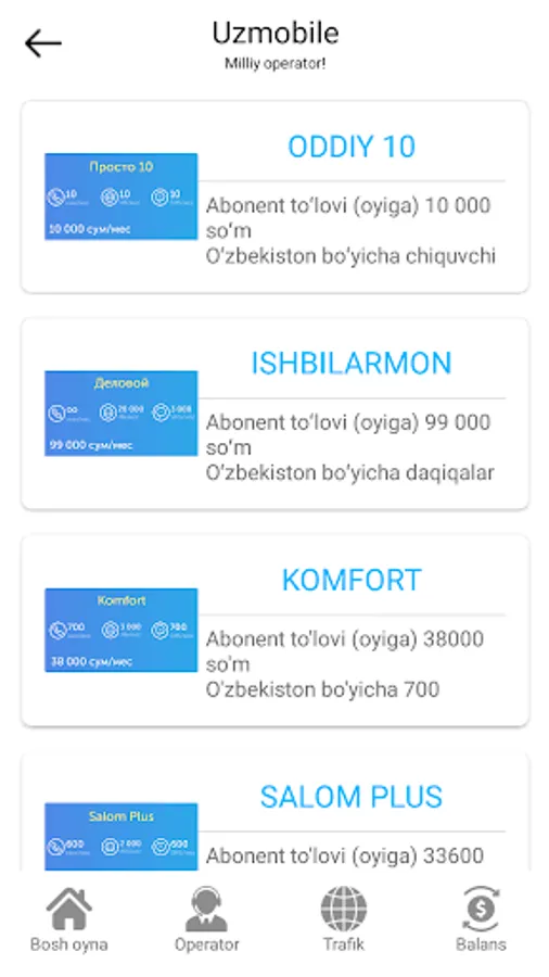 Ushbu ilova yordamida siz bor yo'g'i bir nechta tanlash va svayp orqali barcha operatorlardan xohlagan trafikni, xohlagan tarif va xizmatlarga ulanishni oddiygina amalda oshirishingiz mumkin.