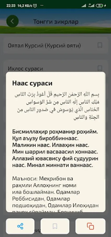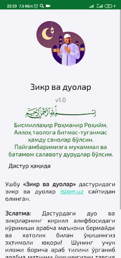 Эслатма: Дастурдаги дуо ва зикрларнинг кирилл алифбосидаги кўриниши арабча маънони бермайди ва хатолик билан ўқишингиз эҳтимоли юқори! Шунинг учун иложи борича араб тилини ўрганиб арабча матнини ўқишингизни тавсия берамиз.